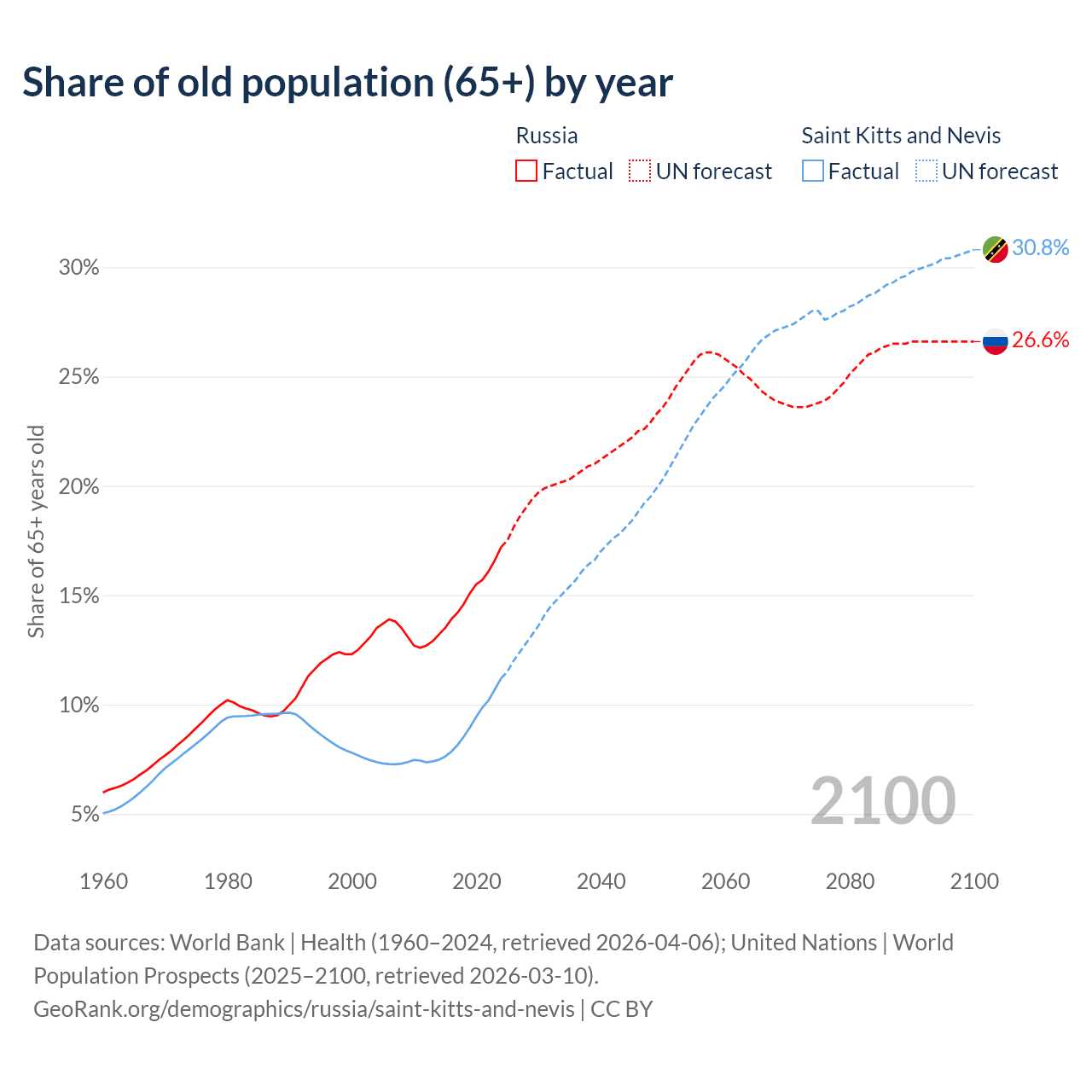 The share of older people aged 65 and over is 17.2% in Russia and 11.2% in Saint Kitts and Nevis. Life expectancy in Russia compared to Saint Kitts and Nevis .