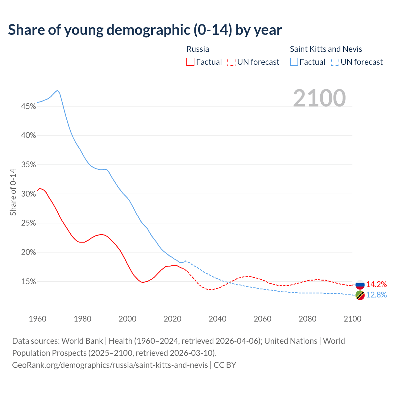 - The share of young demographic (0-15 years old) in Russia is 17.3% vs 18.2% in Saint Kitts and Nevis.