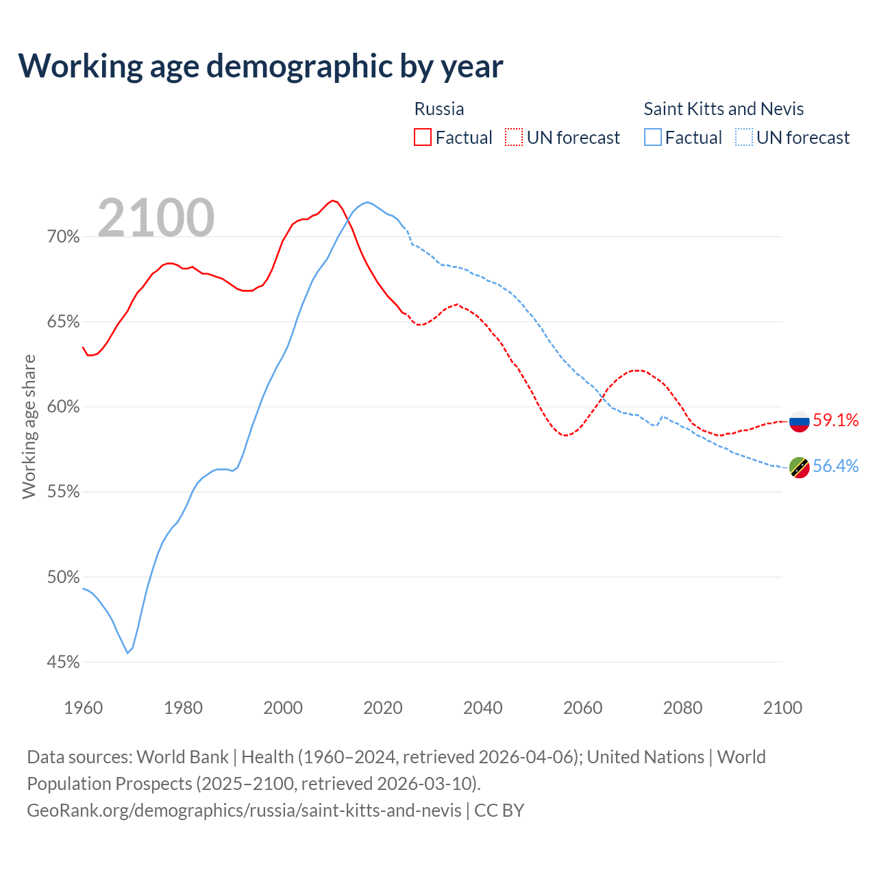- Russia has 93M working age adults (aged 15-64) vs 33.2K in Saint Kitts and Nevis.