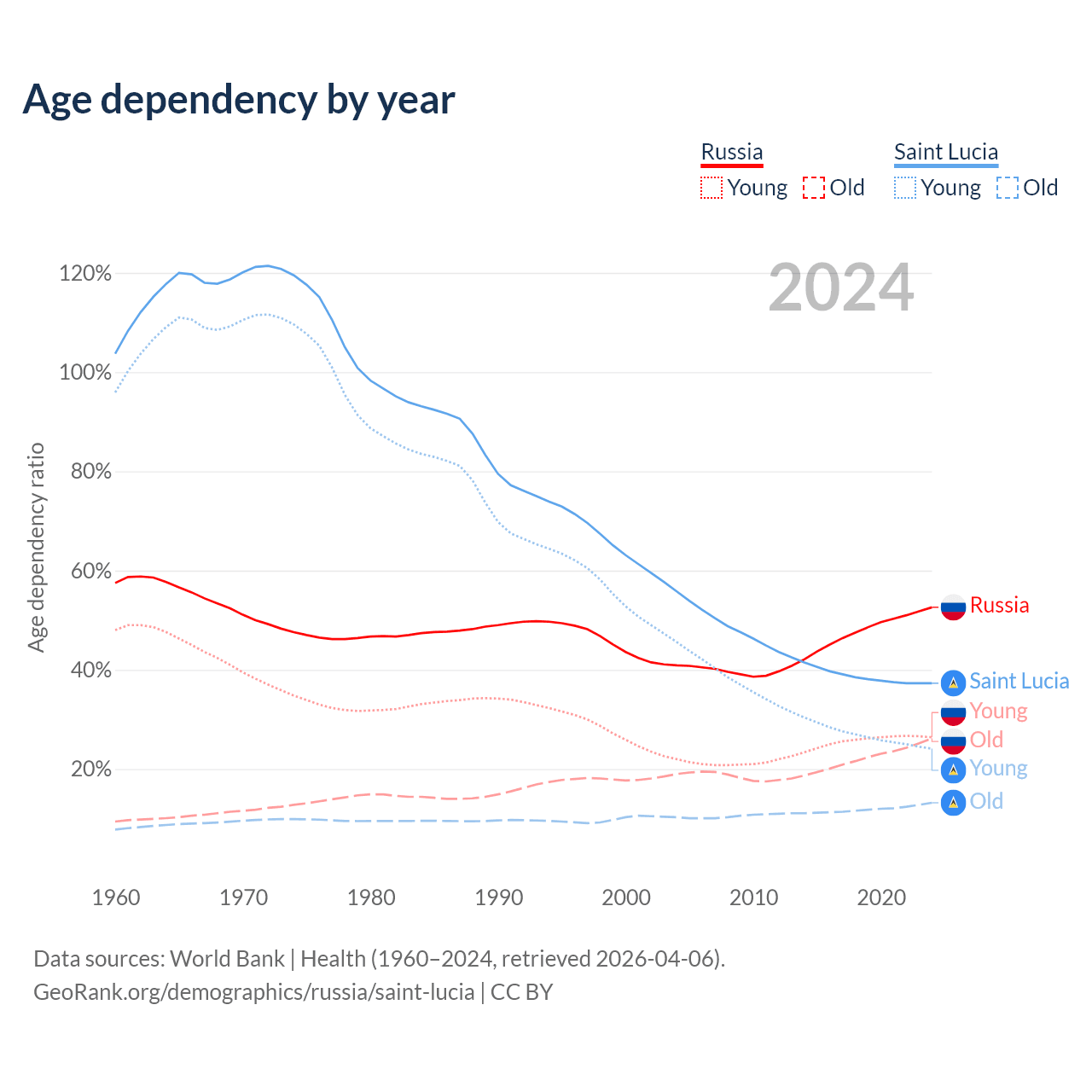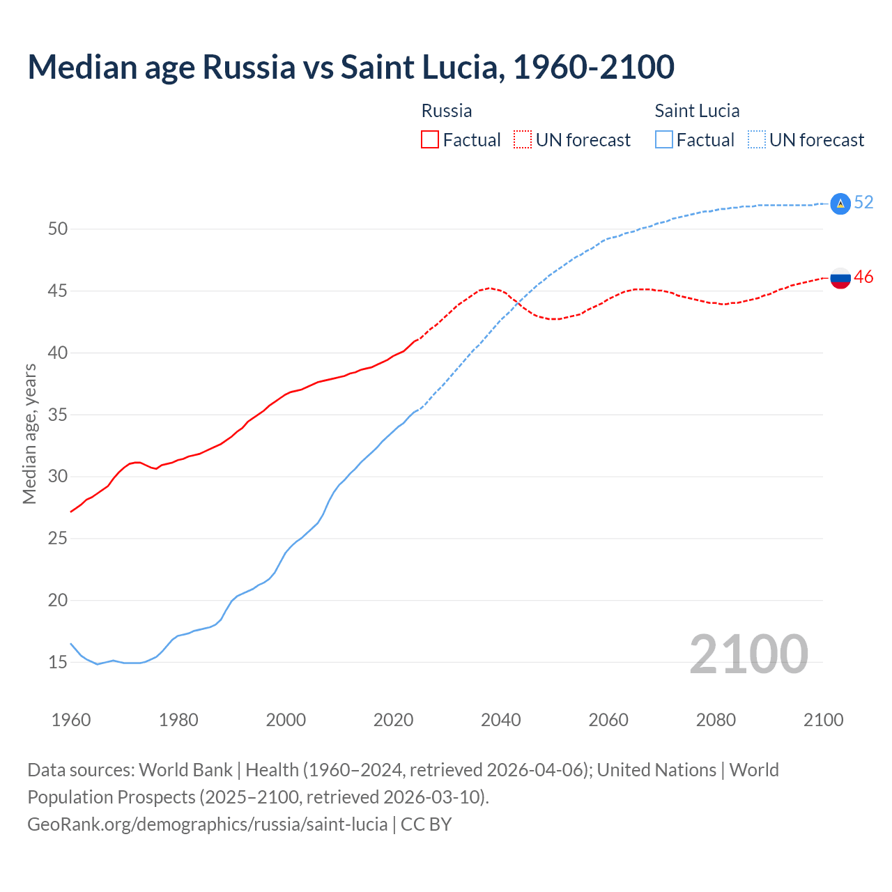 - Russia is ranked 42/196 by median age (oldest to youngest) vs 74/196 for Saint Lucia.