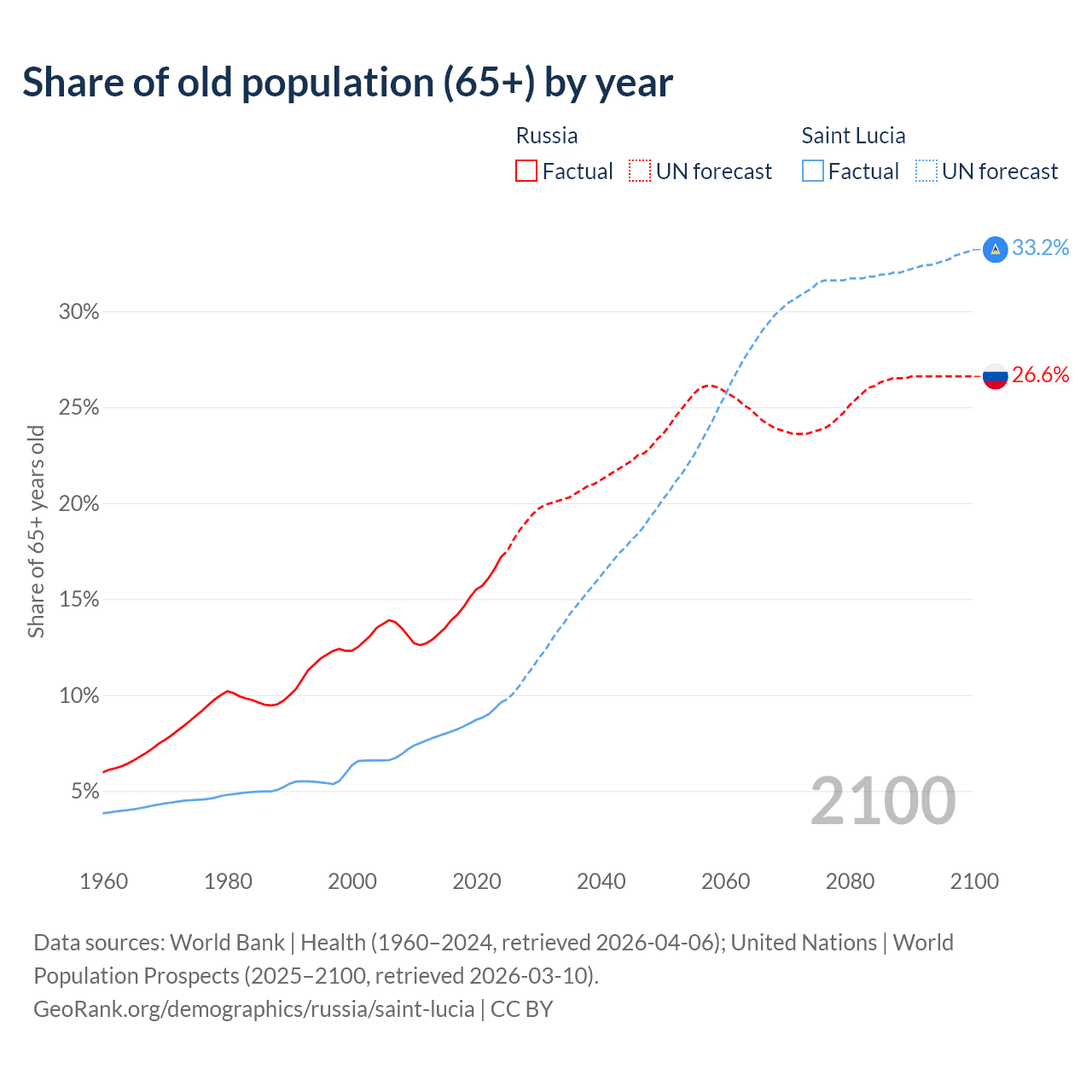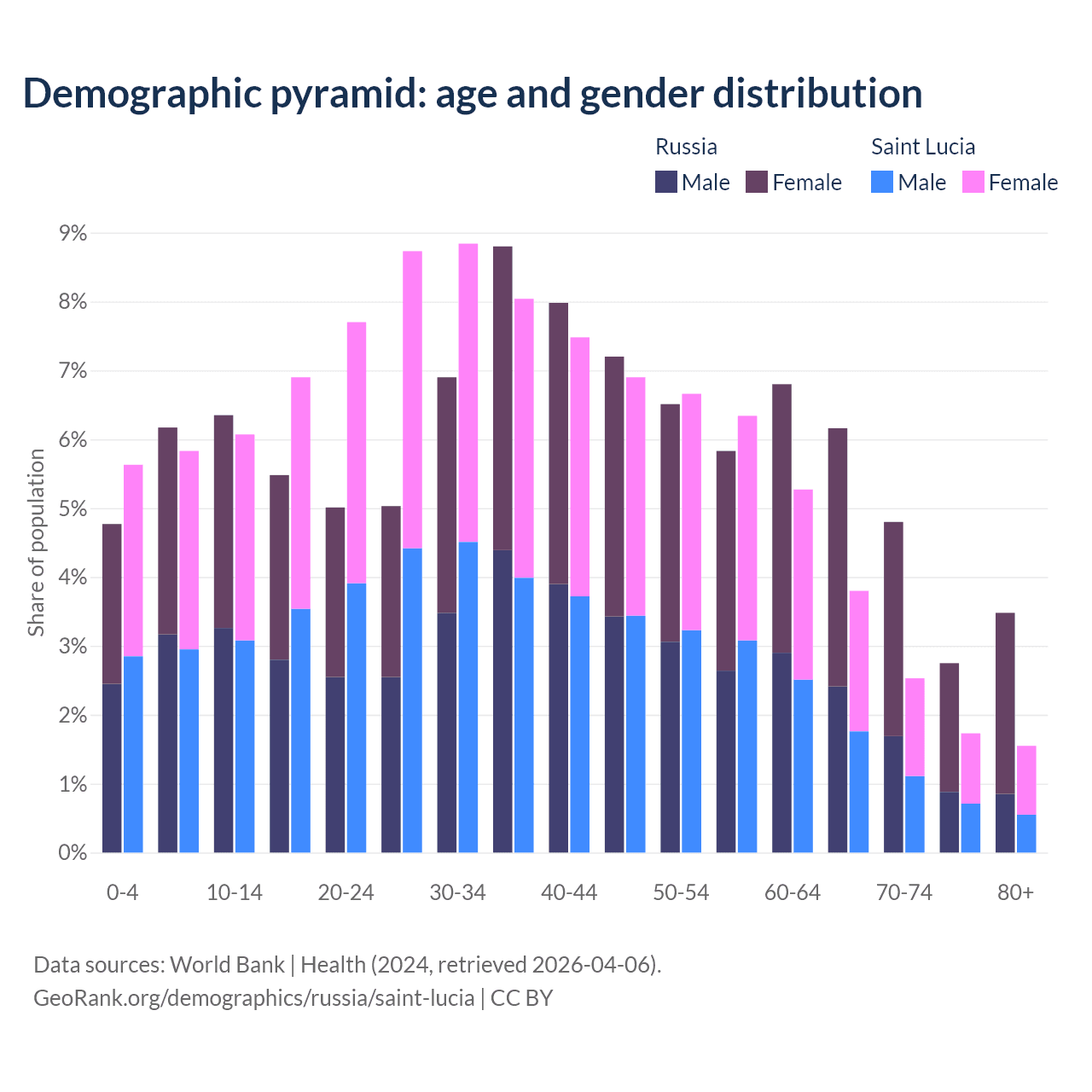 - The share of old-age demographic (65+) in Russia is 17.2% vs 9.62% in Saint Lucia.
