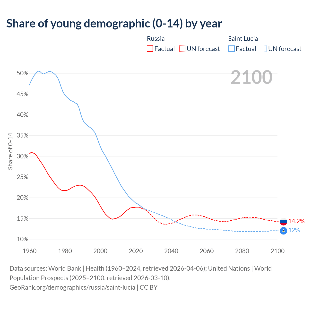 - The share of young demographic (0-15 years old) in Russia is 17.3% vs 17.5% in Saint Lucia.