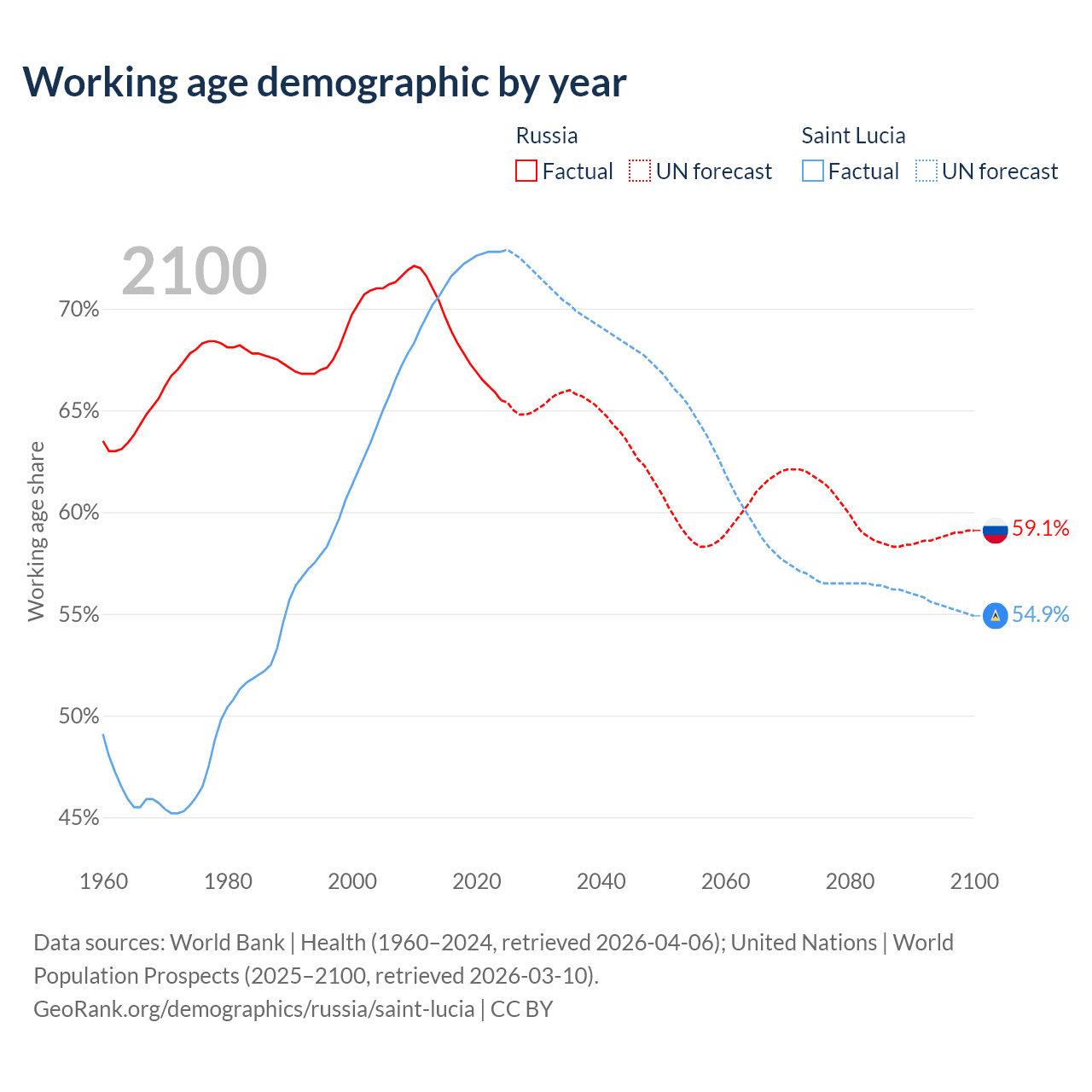 - Russia has 93M working age adults (aged 15-64) vs 132K in Saint Lucia.