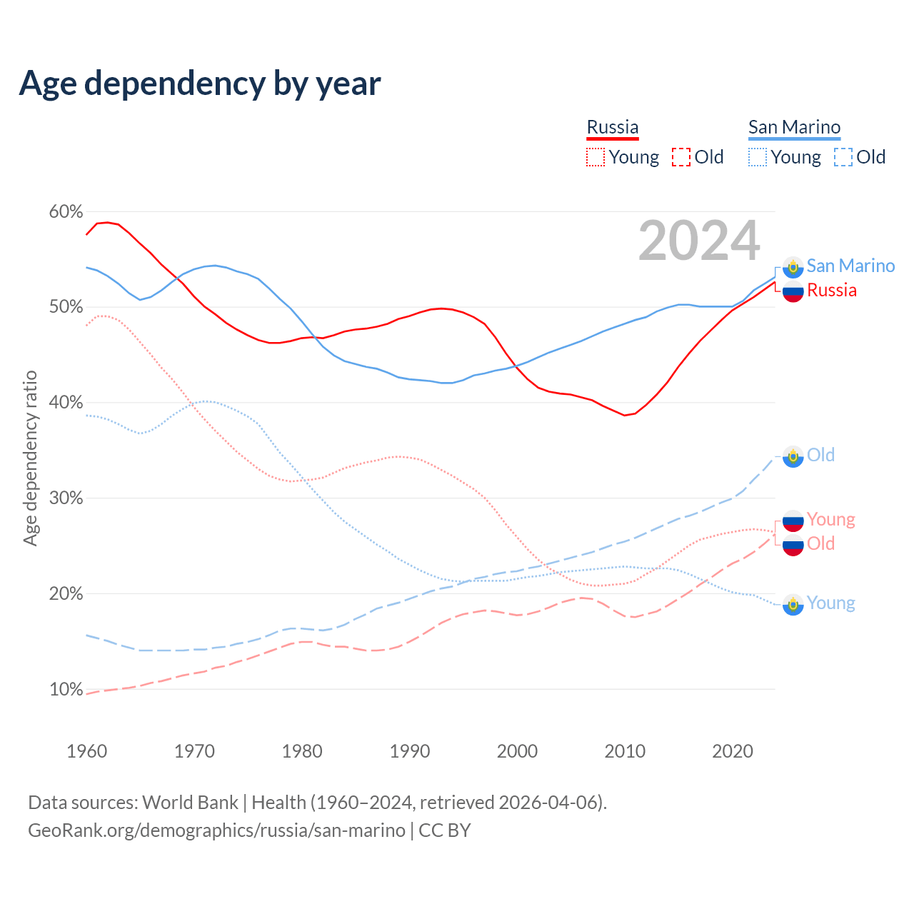 - Russia is ranked 42/196 by median age (oldest to youngest) vs 3/196 for San Marino.