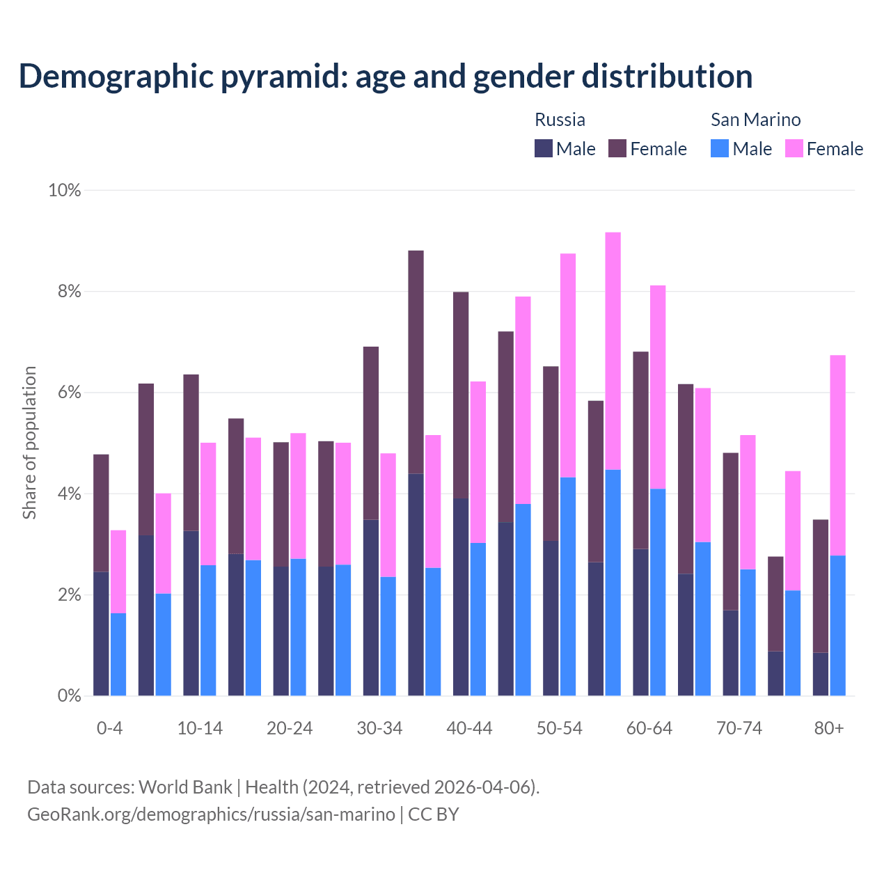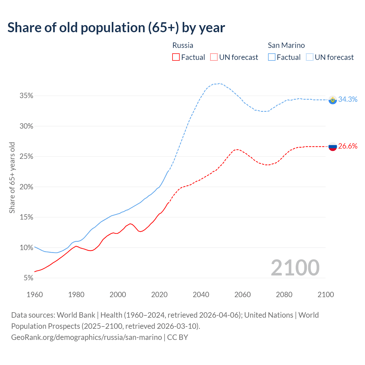 The share of older people aged 65 and over is 17.2% in Russia and 22.4% in San Marino. Life expectancy in Russia compared to San Marino .