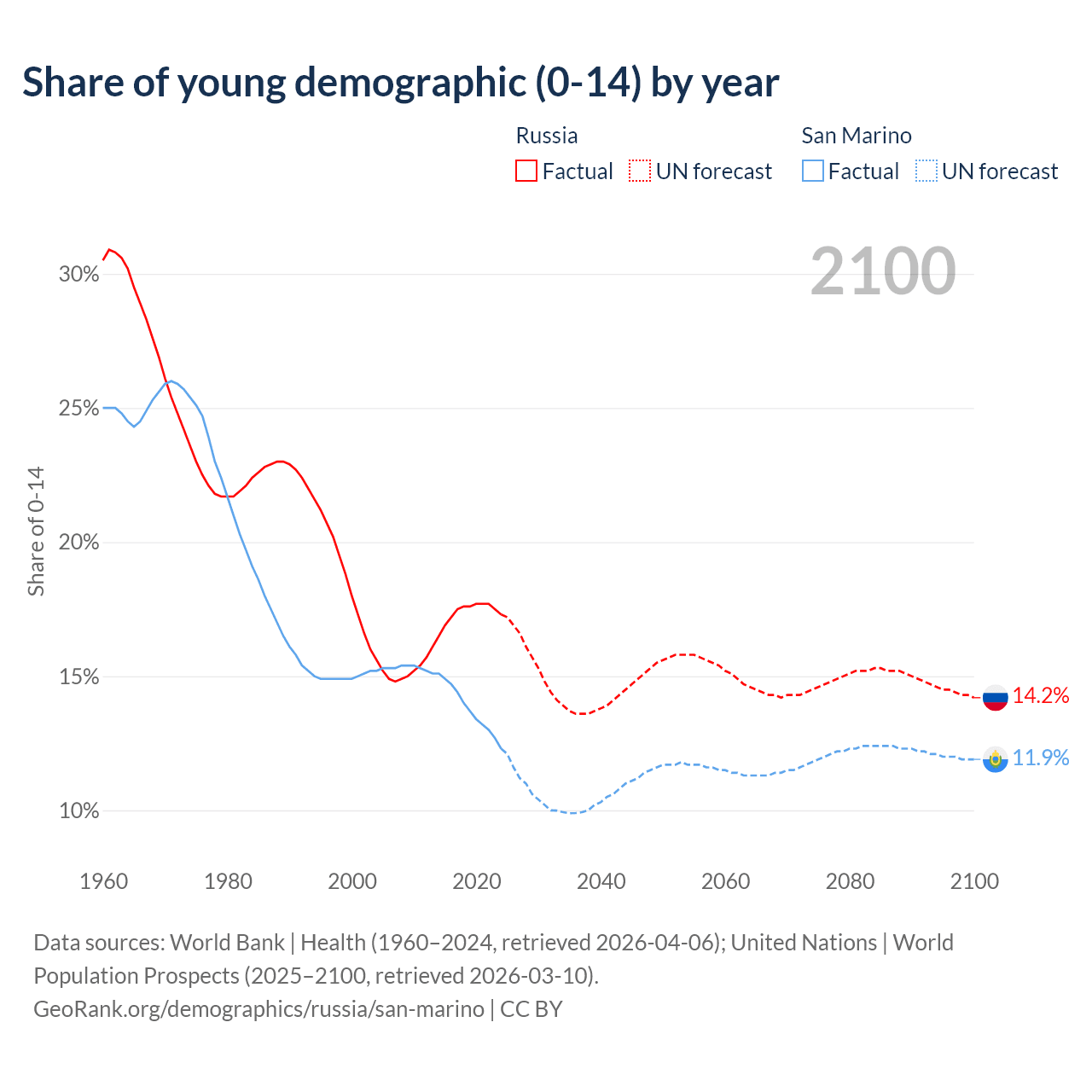 - The share of young demographic (0-15 years old) in Russia is 17.3% vs 12.3% in San Marino.