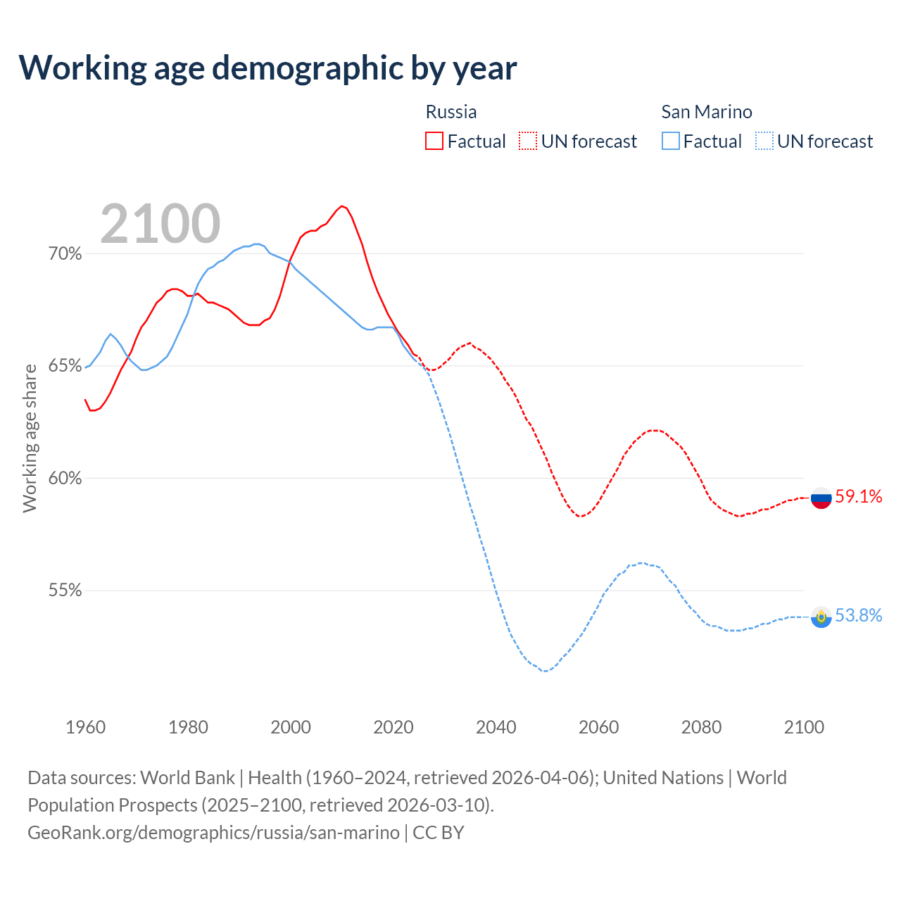 Median age Russia vs San Marino, 1960-2100
