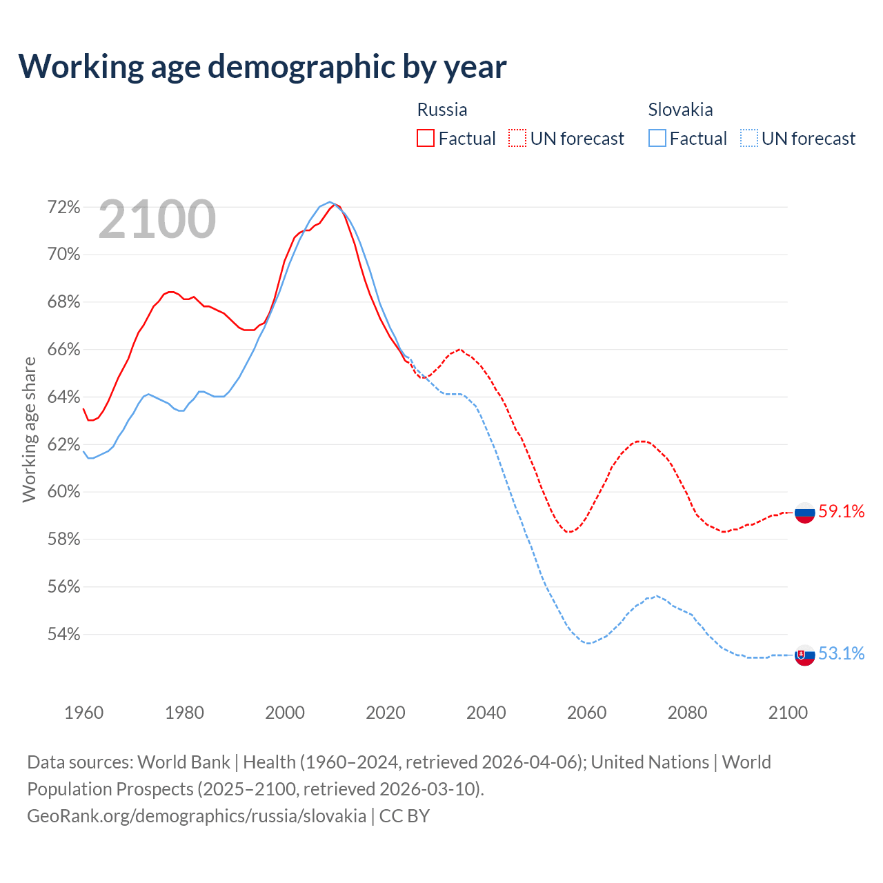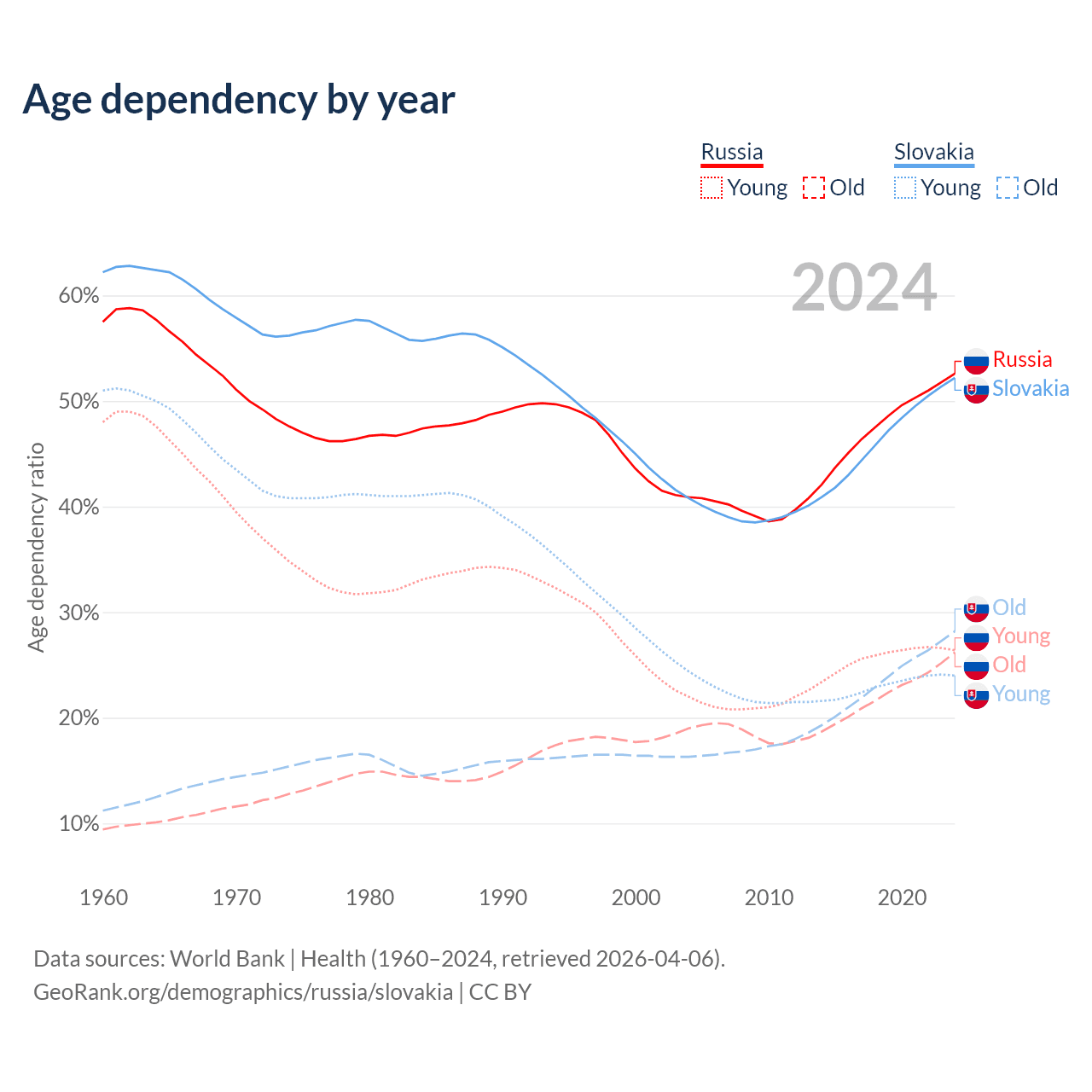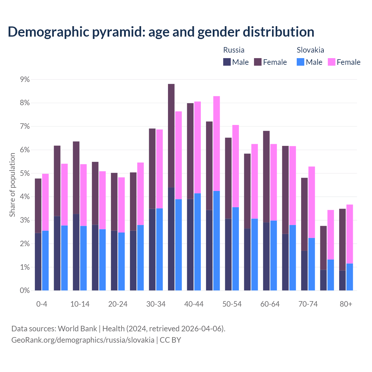 - Russia is ranked 42/196 by median age (oldest to youngest) vs 31/196 for Slovakia.