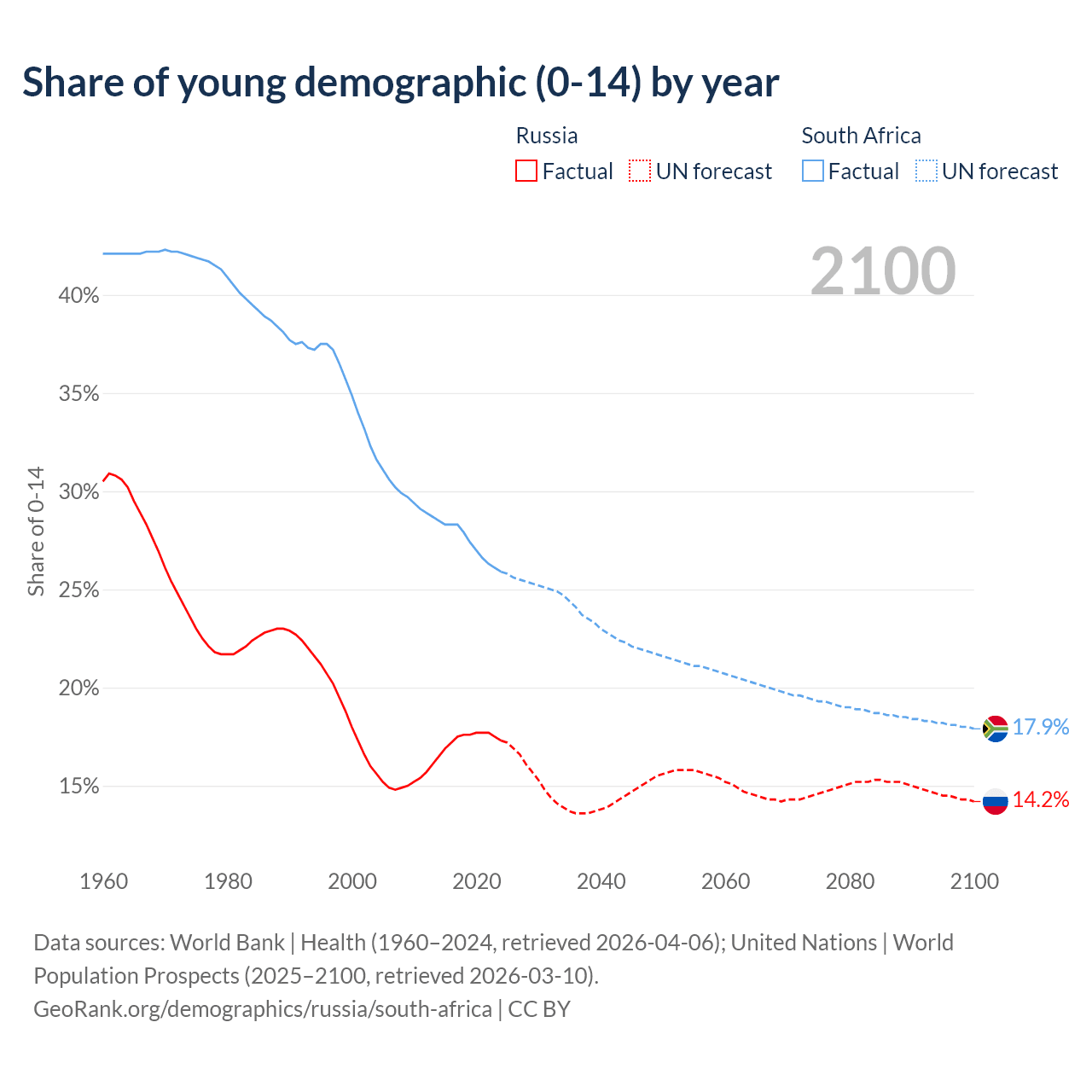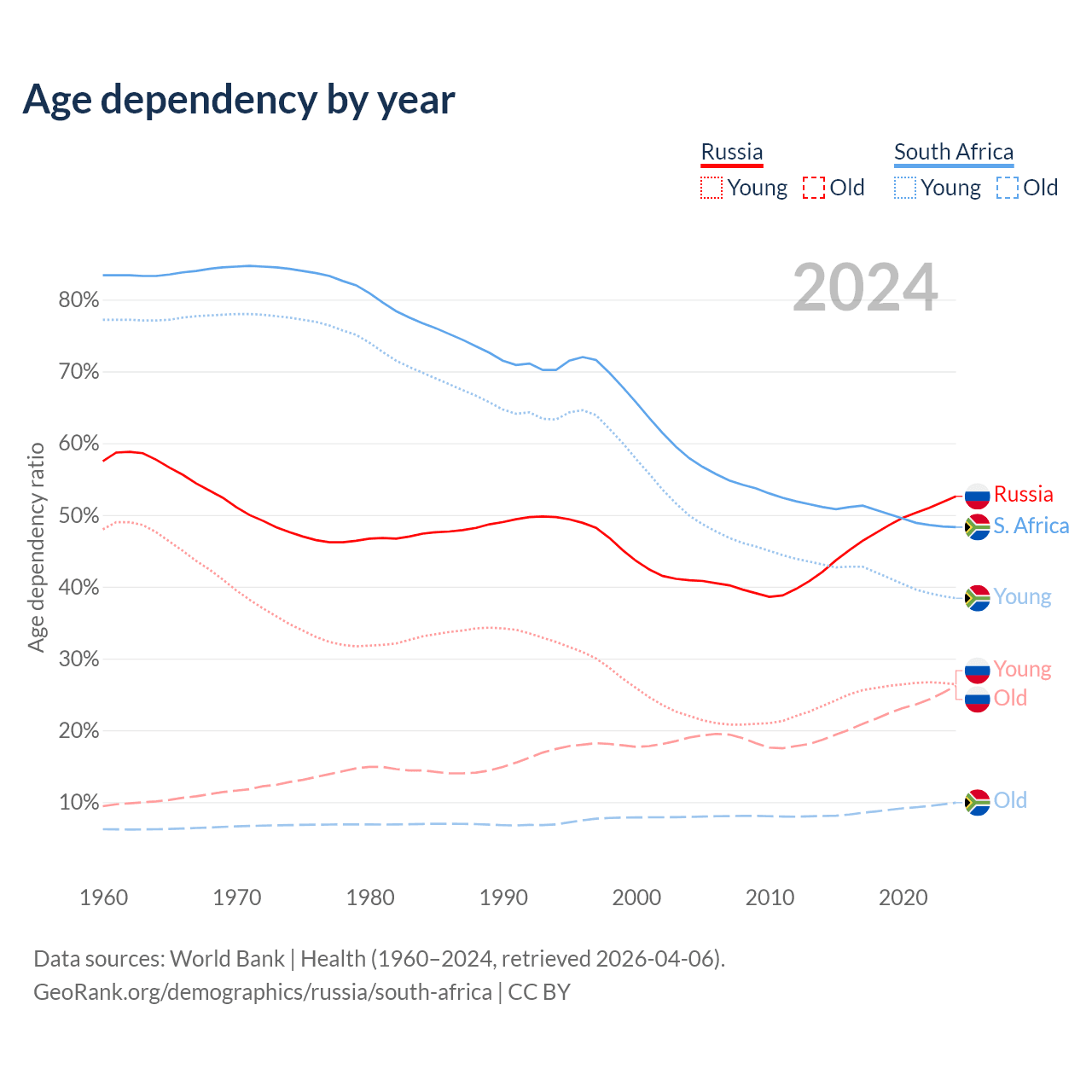 - Russia is ranked 42/196 by median age (oldest to youngest) vs 107/196 for South Africa.