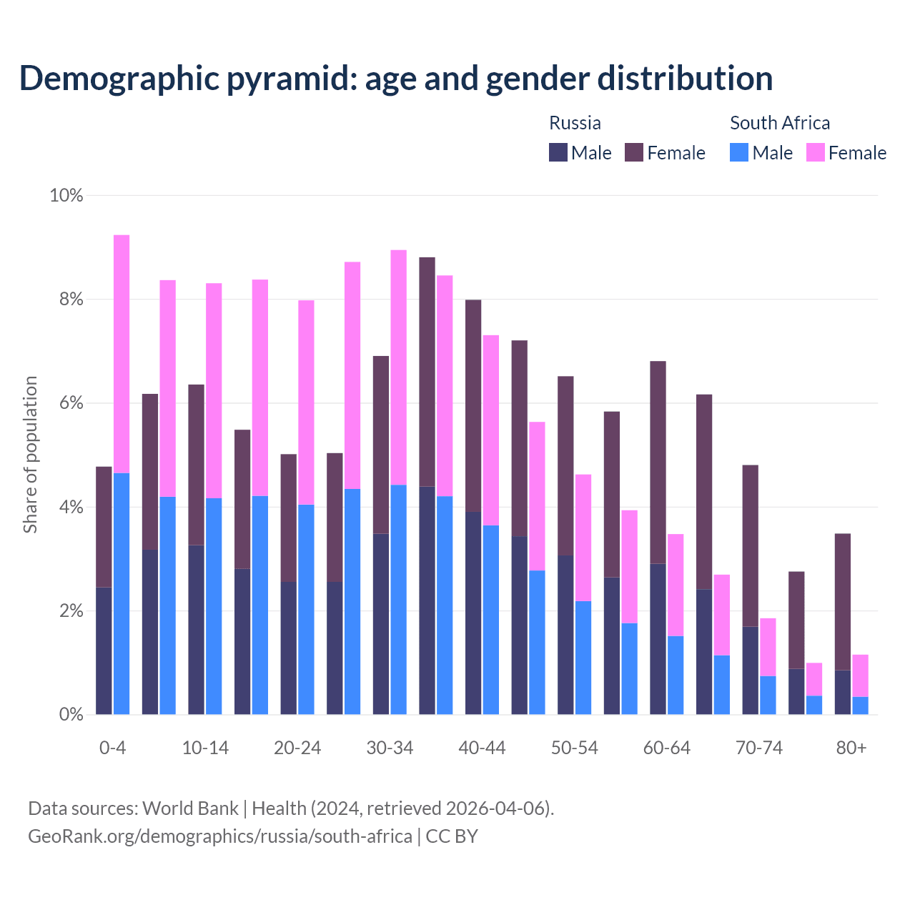 The share of older people aged 65 and over is 17.2% in Russia and 6.69% in South Africa. Life expectancy in Russia compared to South Africa .