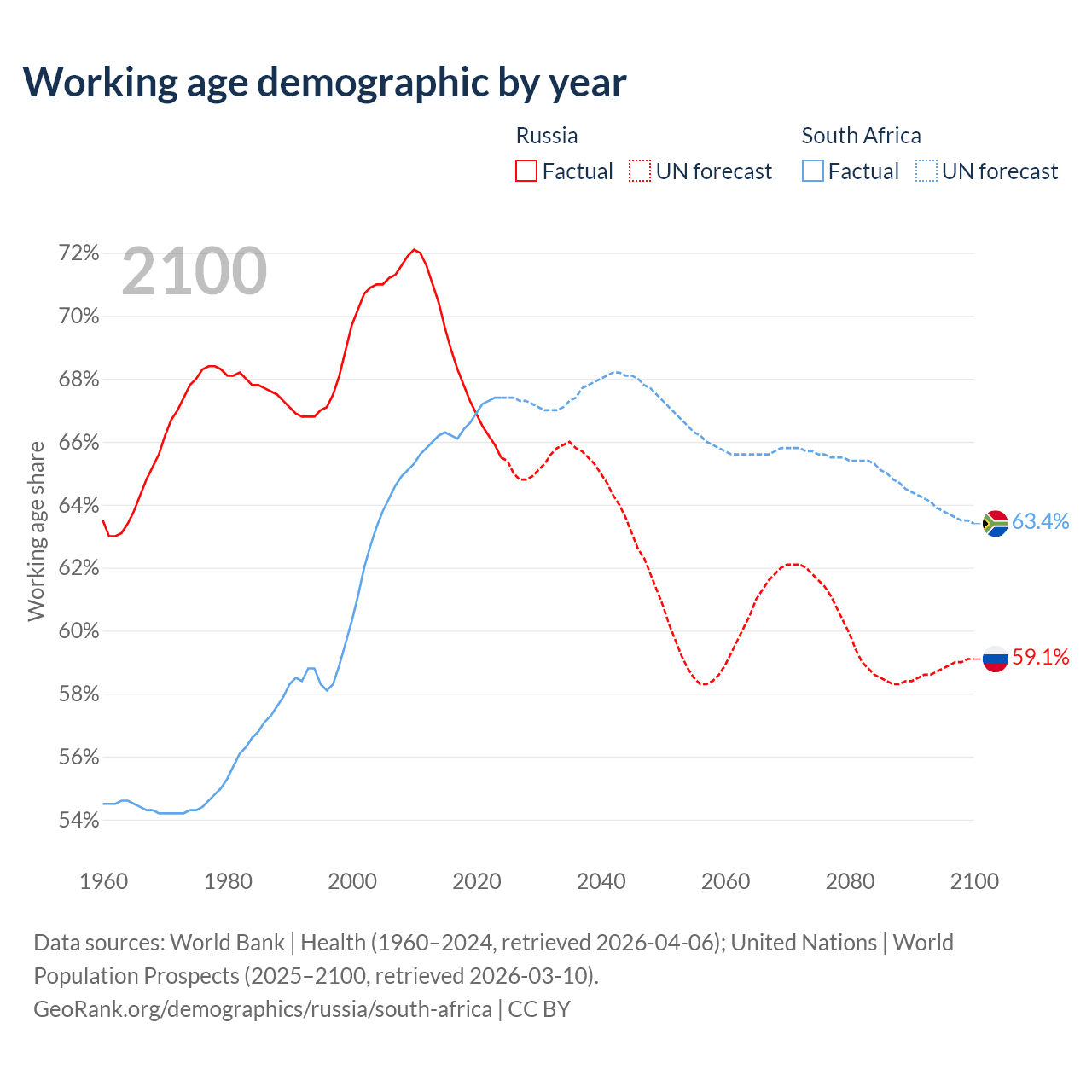 - Russia has 93M working age adults (aged 15-64) vs 44.3M in South Africa.