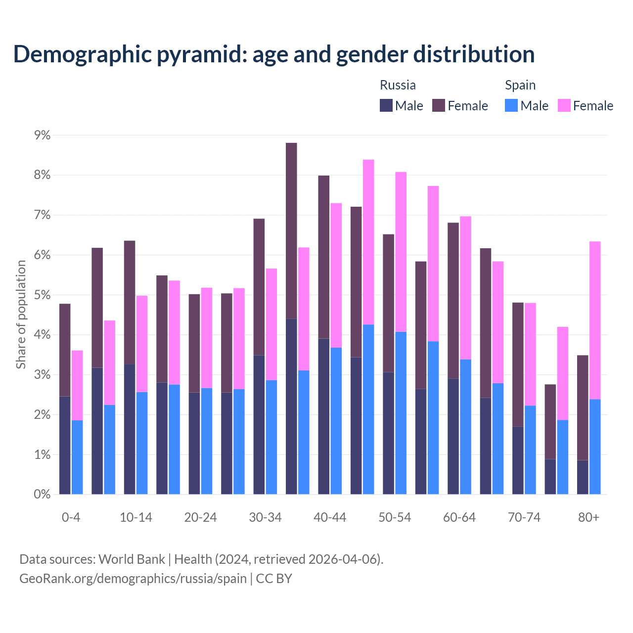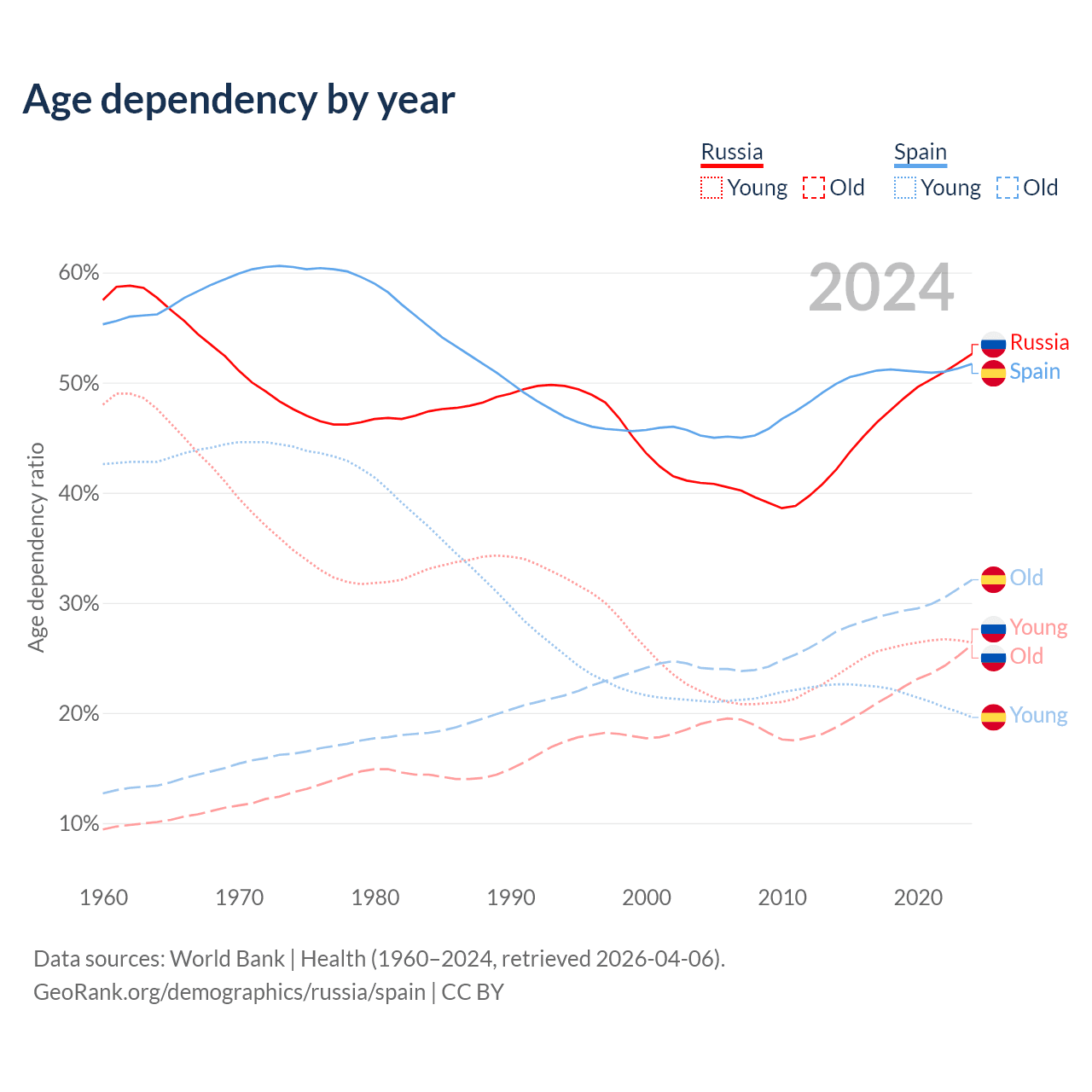 - Russia is ranked 42/196 by median age (oldest to youngest) vs 7/196 for Spain.