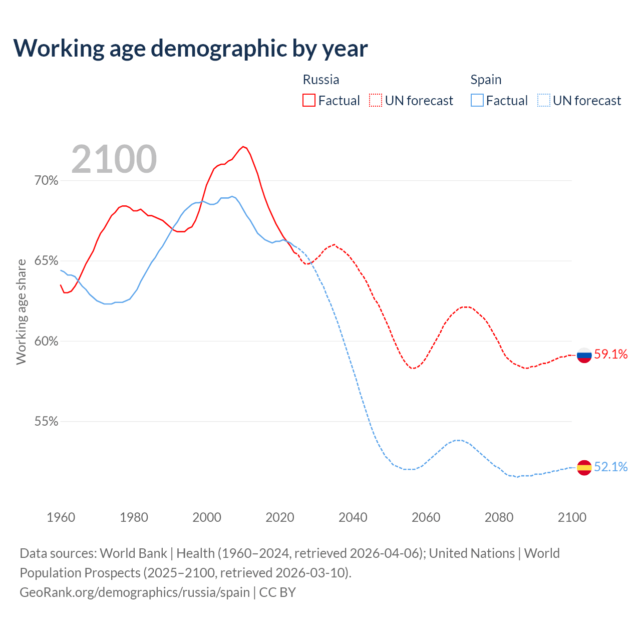 - Russia has 93M working age adults (aged 15-64) vs 32.2M in Spain.
