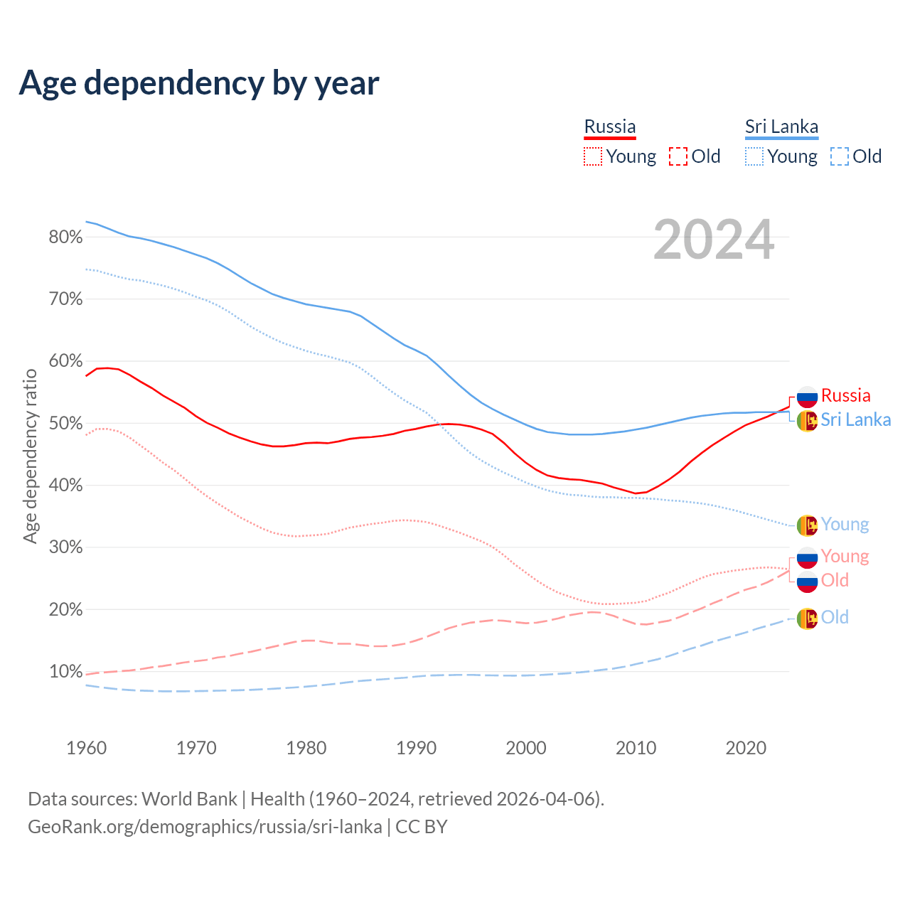 - Russia is ranked 42/196 by median age (oldest to youngest) vs 81/196 for Sri Lanka.