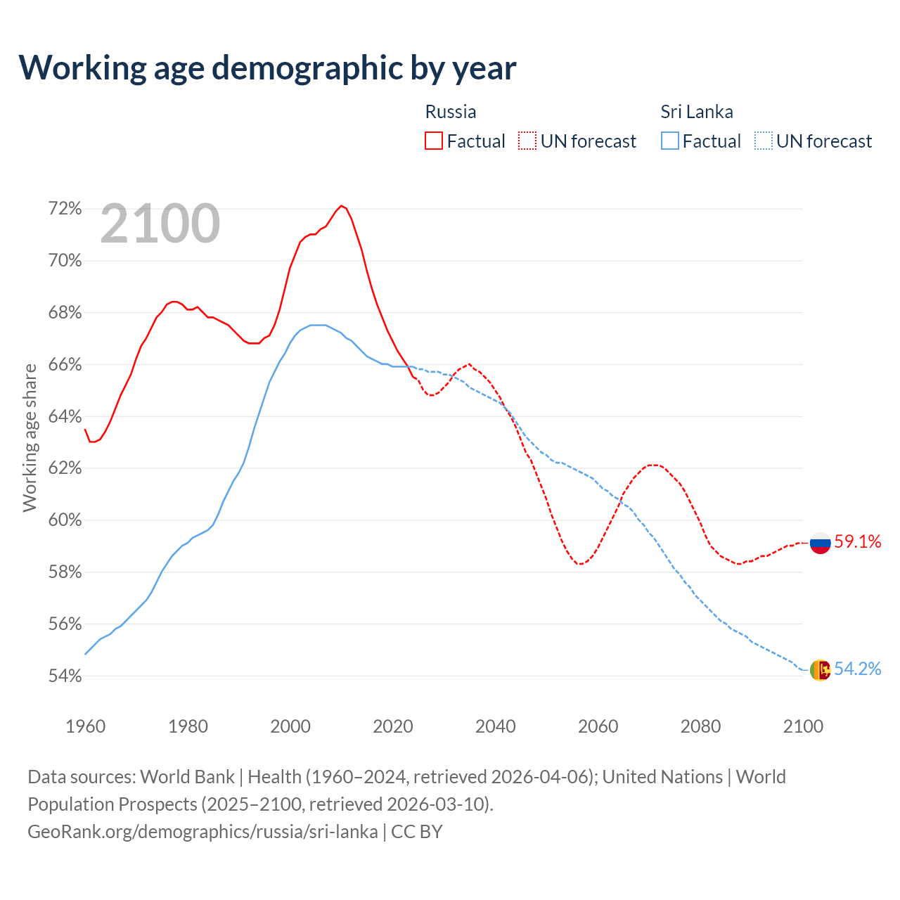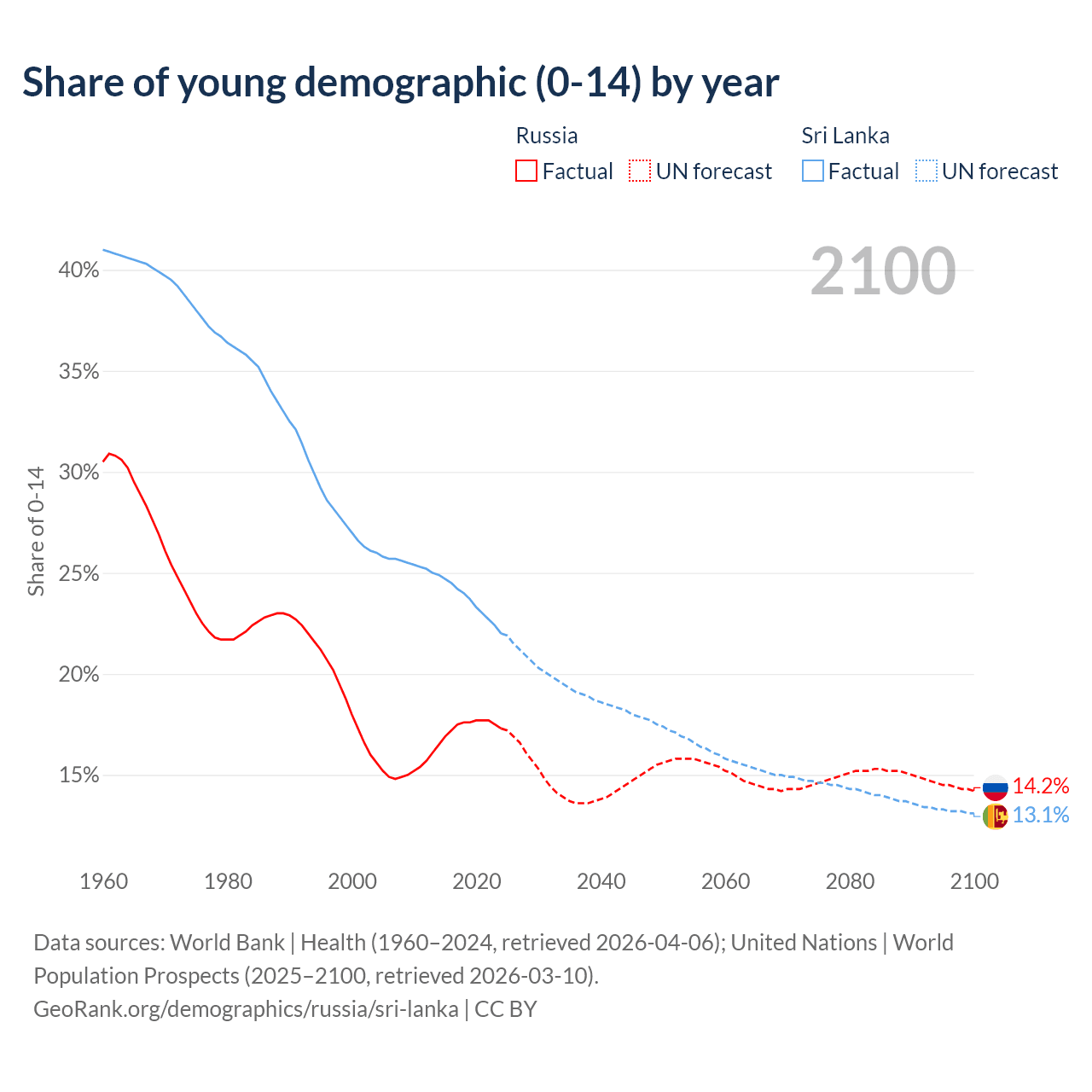 Median age Russia vs Sri Lanka, 1960-2100