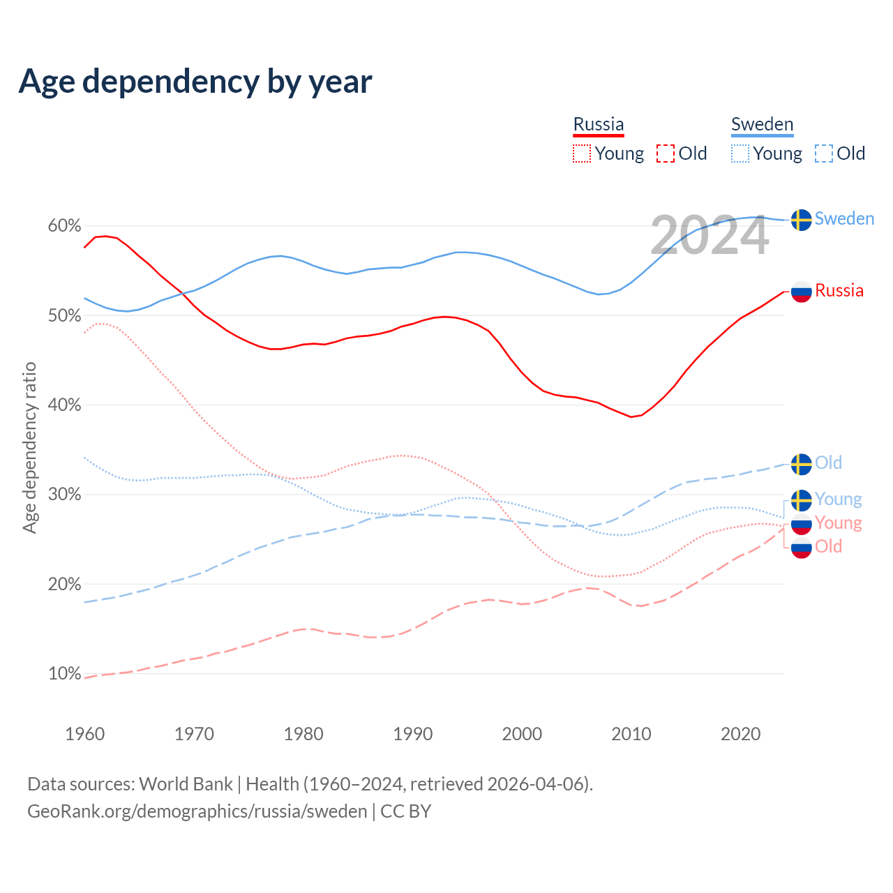 - Russia is ranked 42/196 by median age (oldest to youngest) vs 39/196 for Sweden.