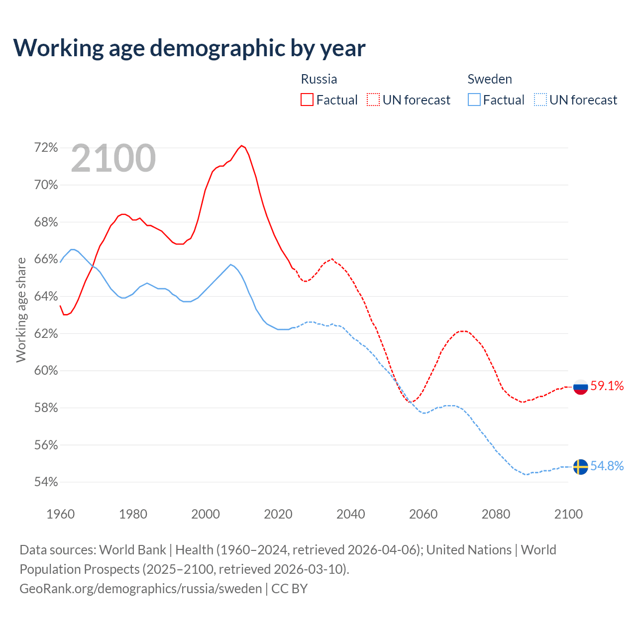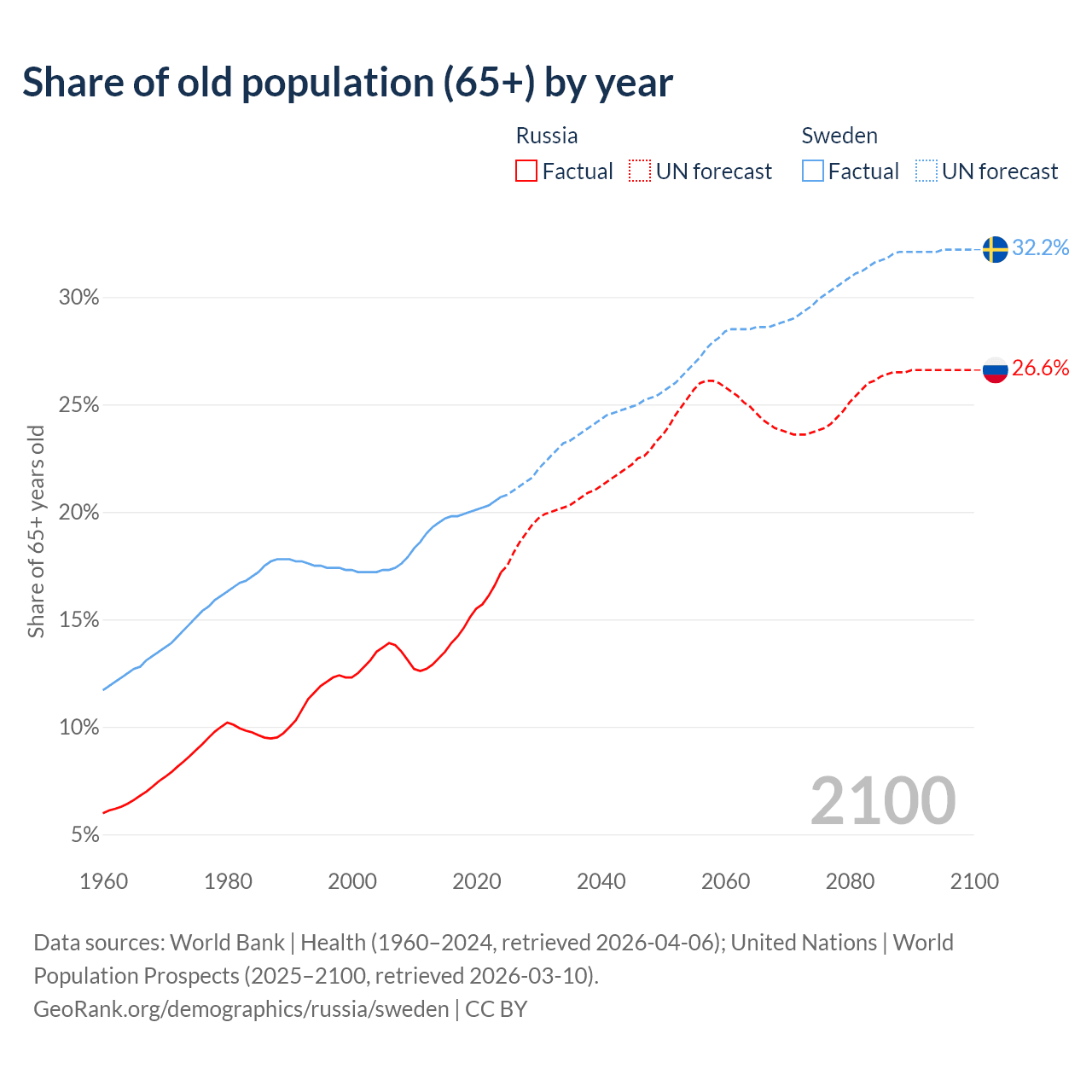 The share of older people aged 65 and over is 17.2% in Russia and 20.7% in Sweden. Life expectancy in Russia compared to Sweden .
