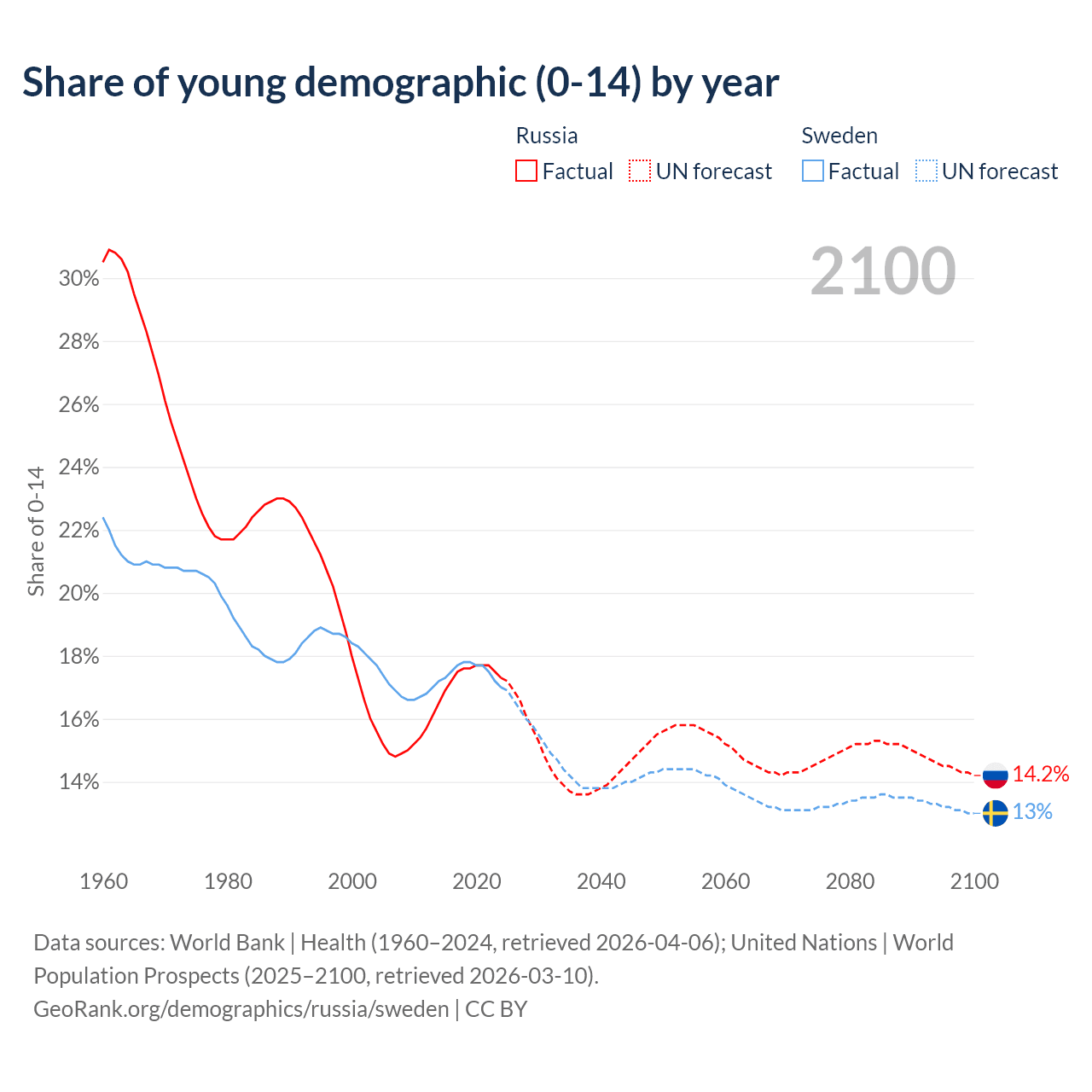 - The share of young demographic (0-15 years old) in Russia is 17.3% vs 17% in Sweden.