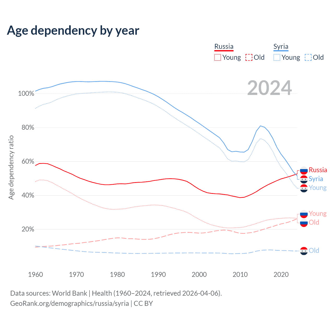 - The share of old-age demographic (65+) in Russia is 17.2% vs 4.74% in Syria.