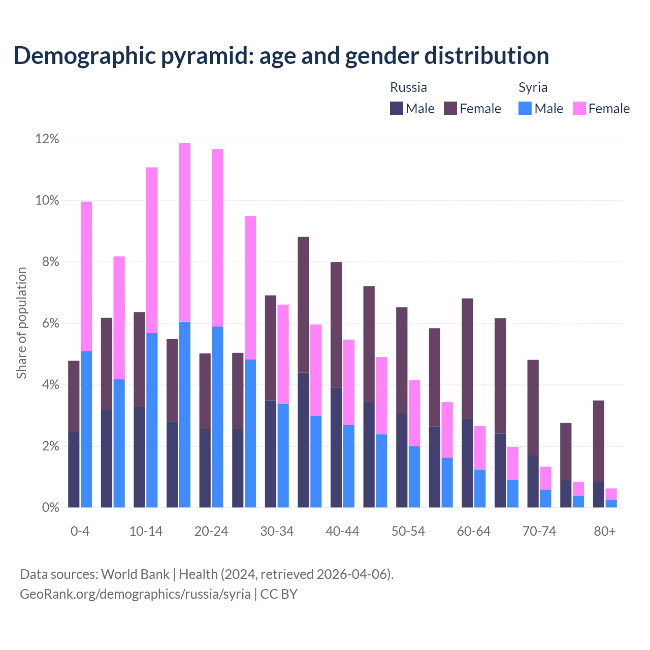 - Russia is ranked 42/196 by median age (oldest to youngest) vs 138/196 for Syria.