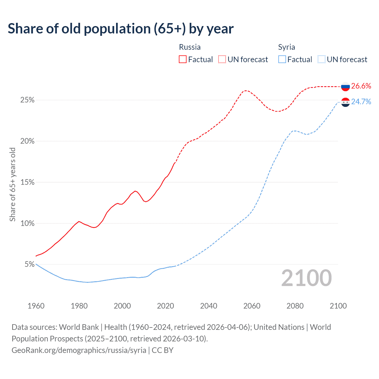 The share of older people aged 65 and over is 17.2% in Russia and 4.74% in Syria. Life expectancy in Russia compared to Syria .
