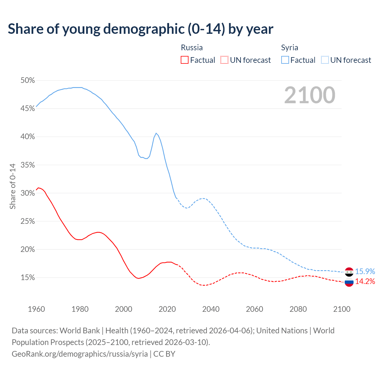 - The share of young demographic (0-15 years old) in Russia is 17.3% vs 29.2% in Syria.