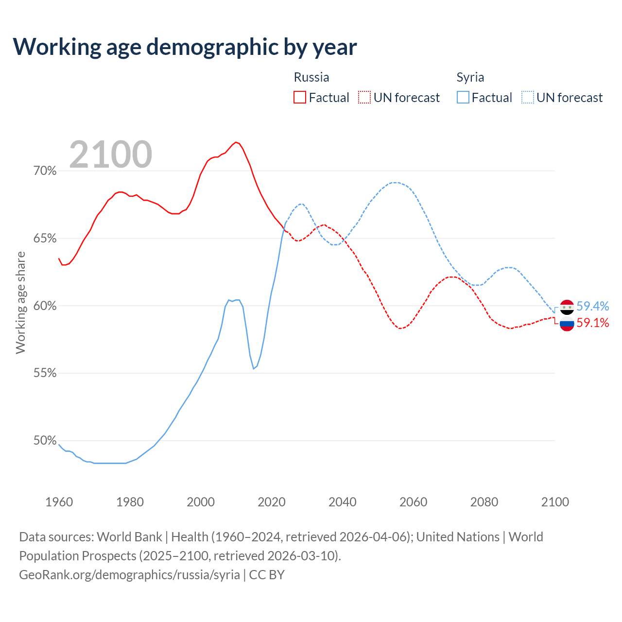 - Russia has 93M working age adults (aged 15-64) vs 17.7M in Syria.