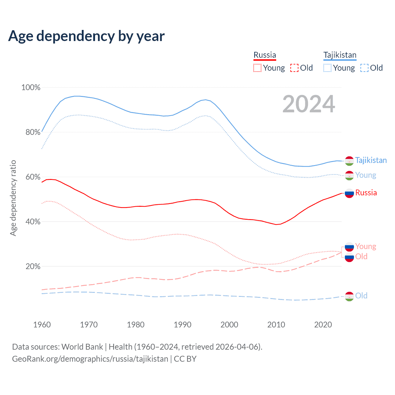- Russia is ranked 42/196 by median age (oldest to youngest) vs 142/196 for Tajikistan.