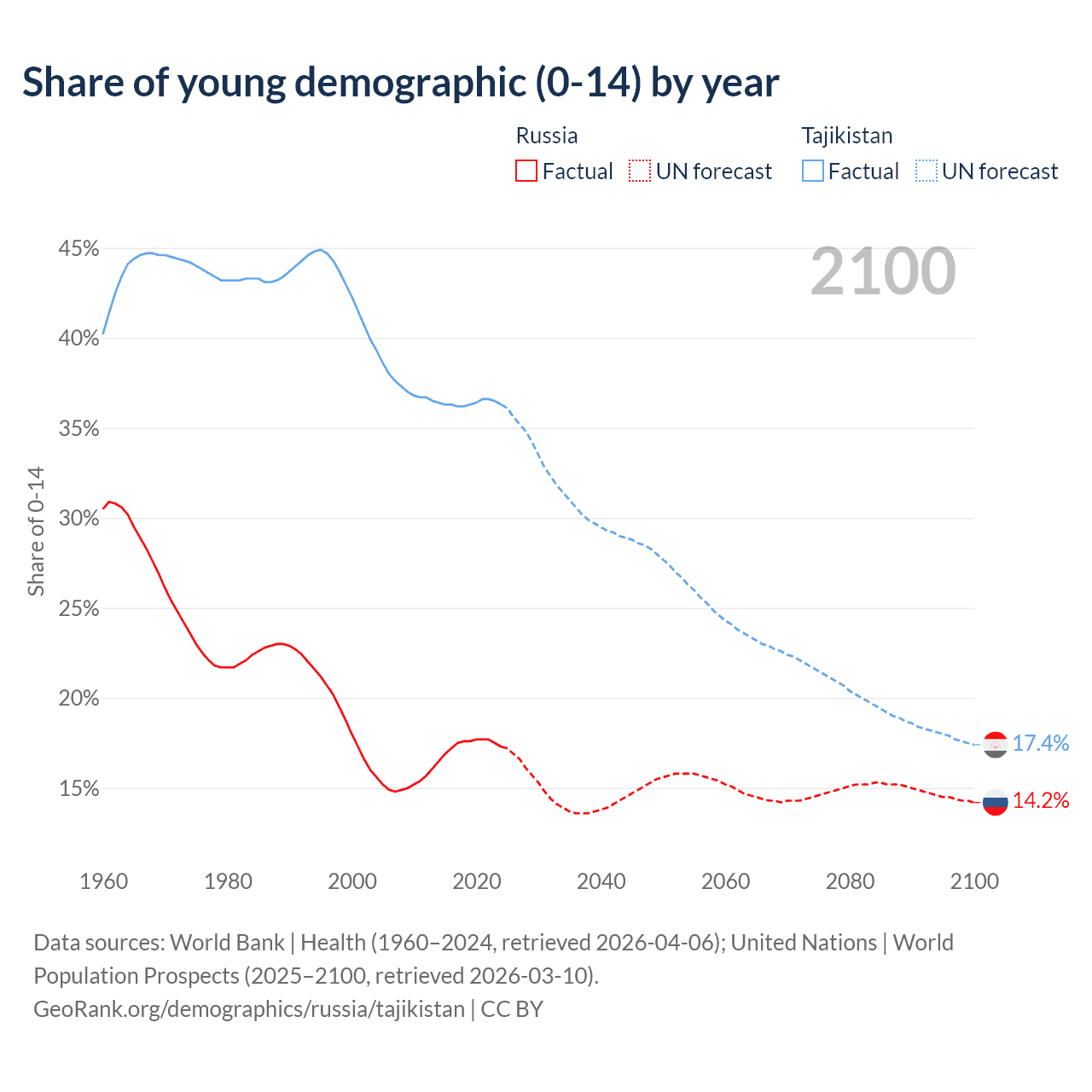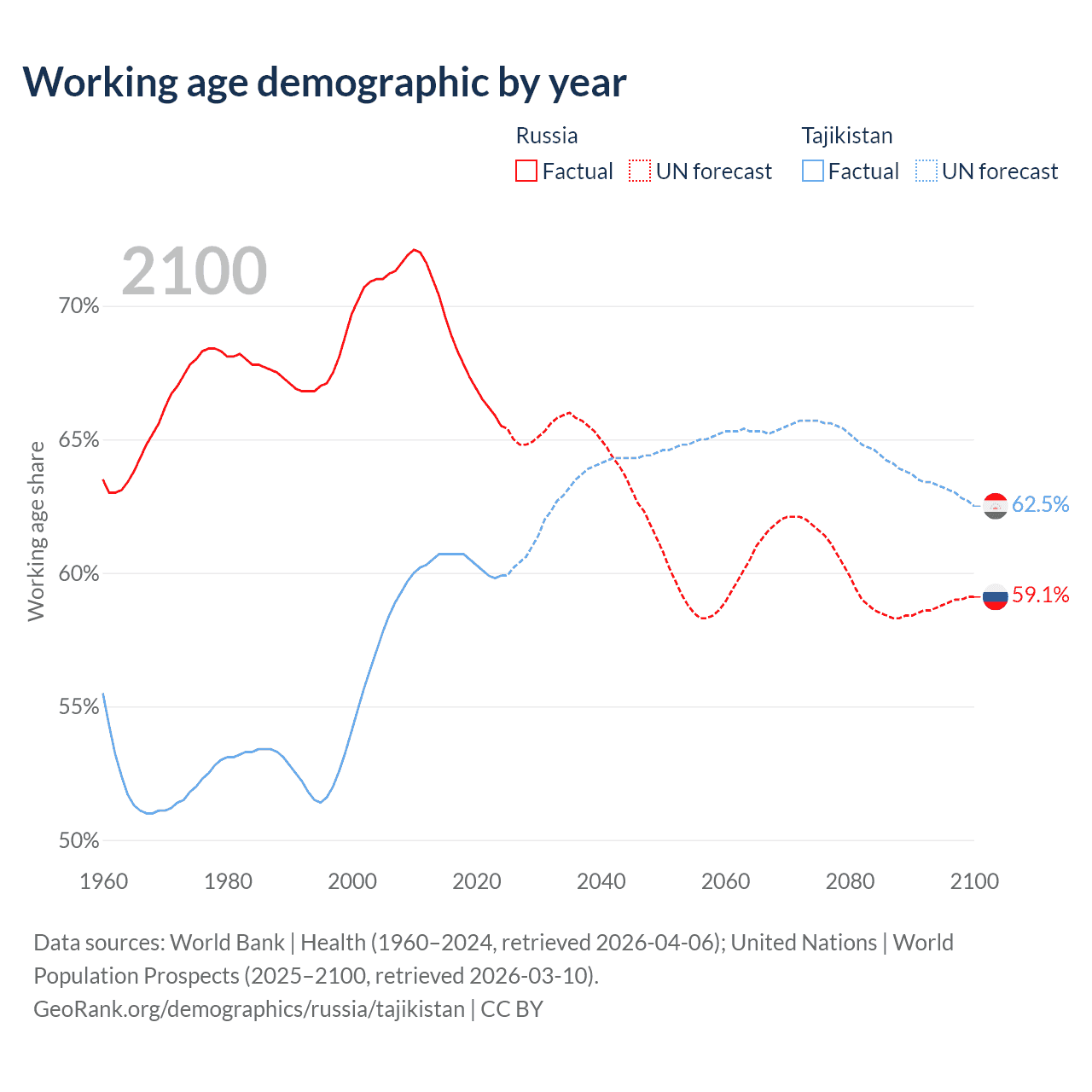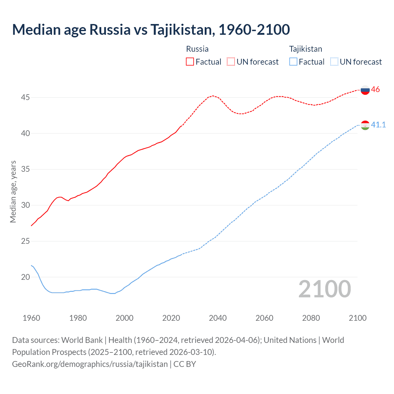 Median age Russia vs Tajikistan, 1960-2100