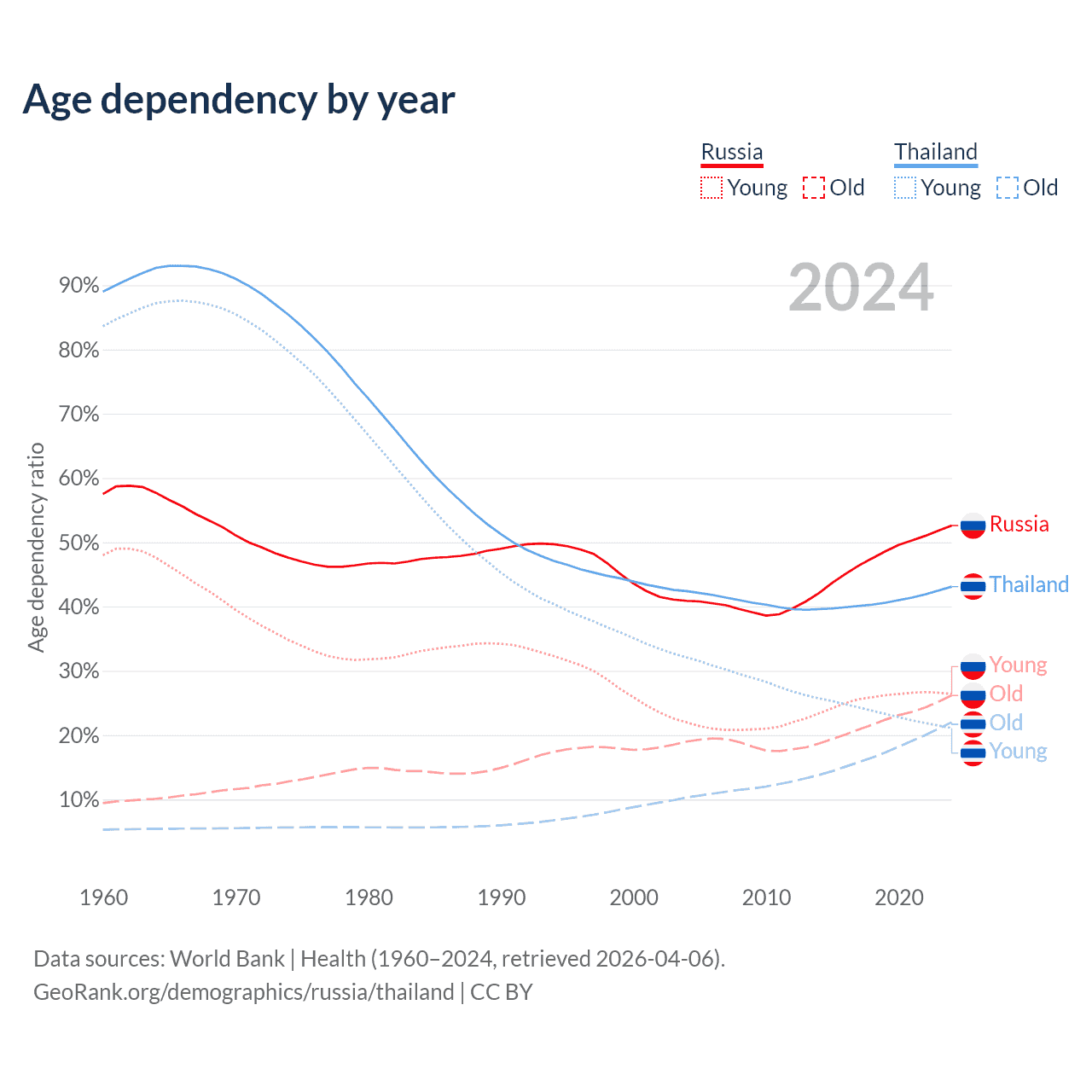 - Russia is ranked 42/196 by median age (oldest to youngest) vs 40/196 for Thailand.