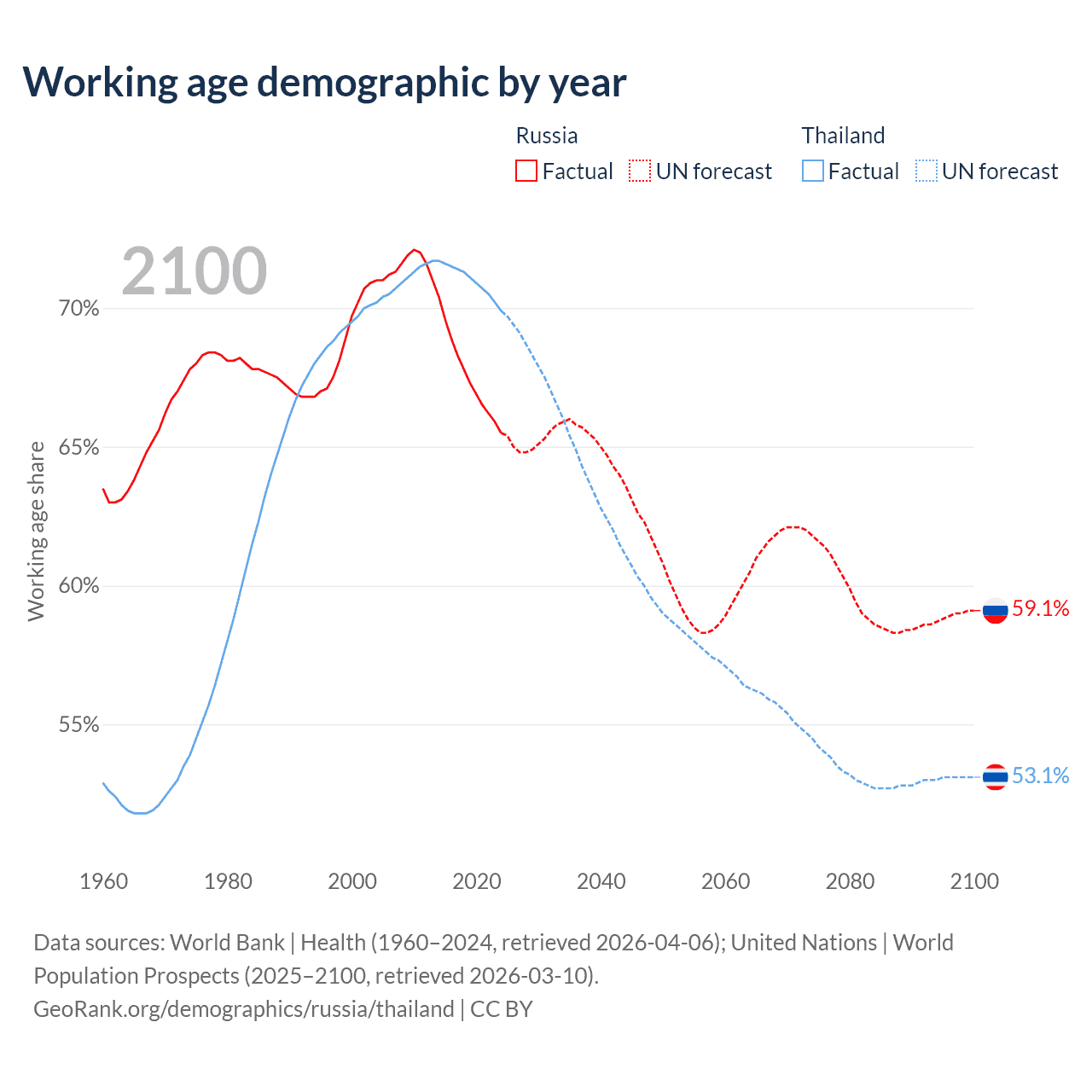 Median age Russia vs Thailand, 1960-2100