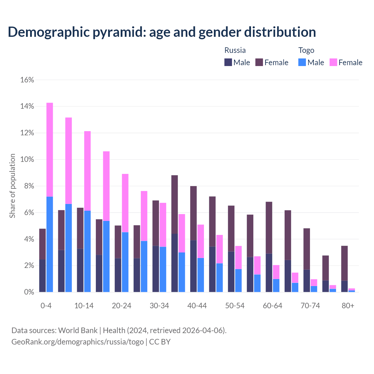 The share of older people aged 65 and over is 17.2% in Russia and 3.21% in Togo. Life expectancy in Russia compared to Togo .