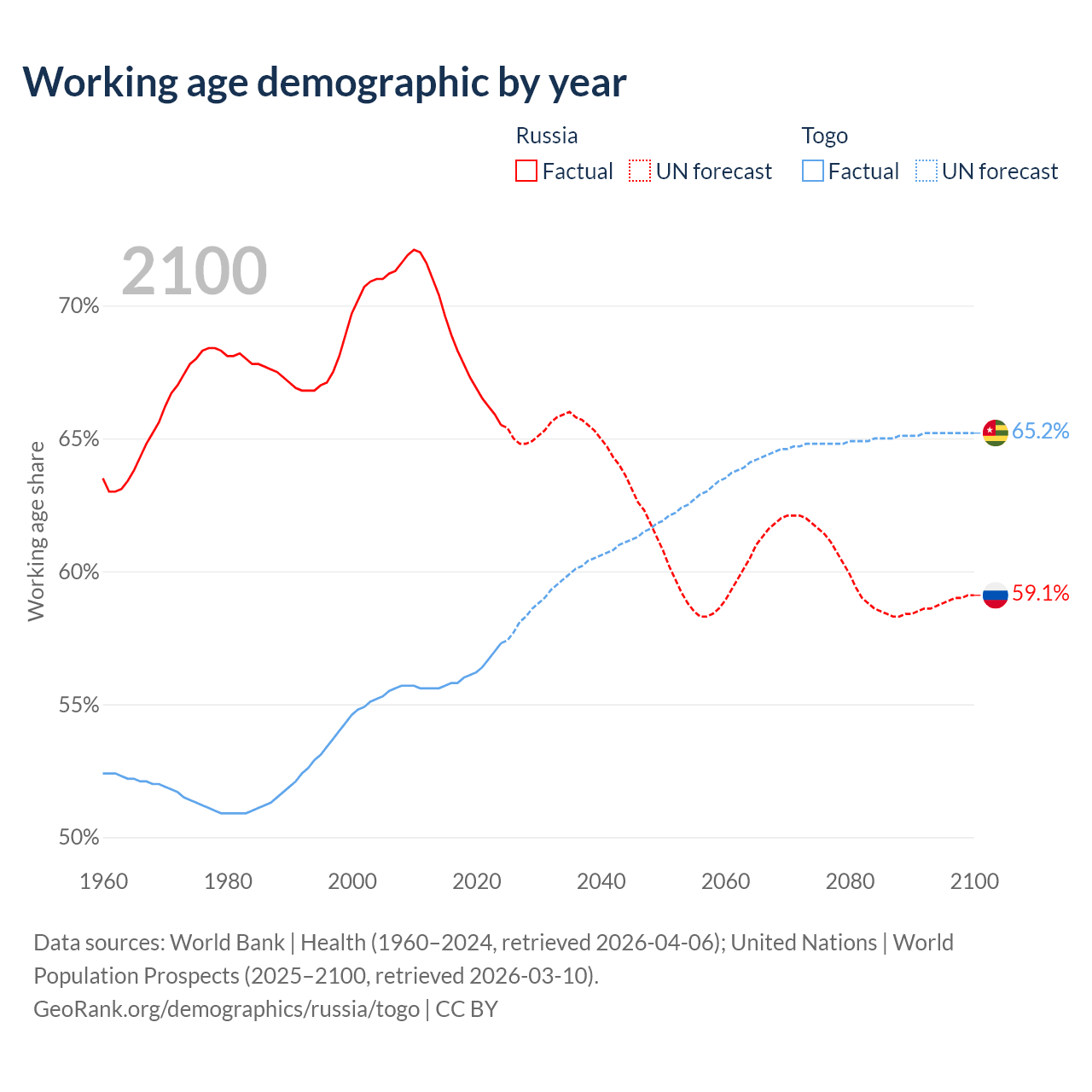 - Russia has 93M working age adults (aged 15-64) vs 5.72M in Togo.