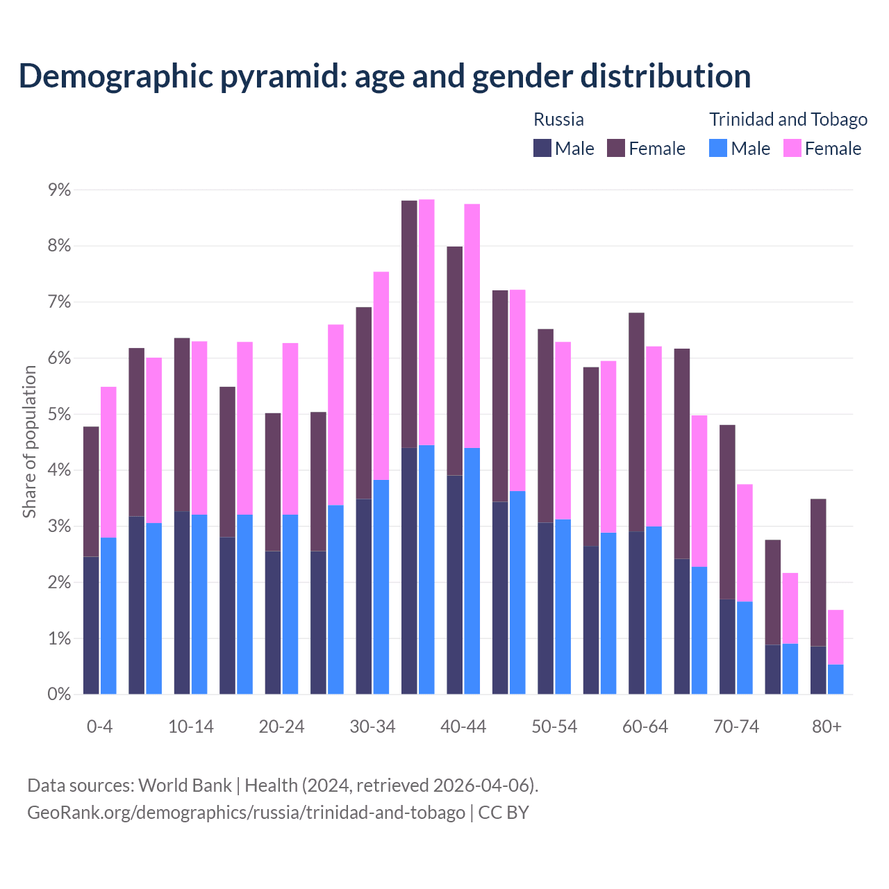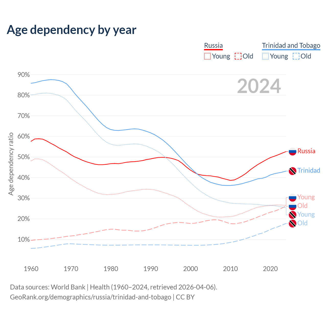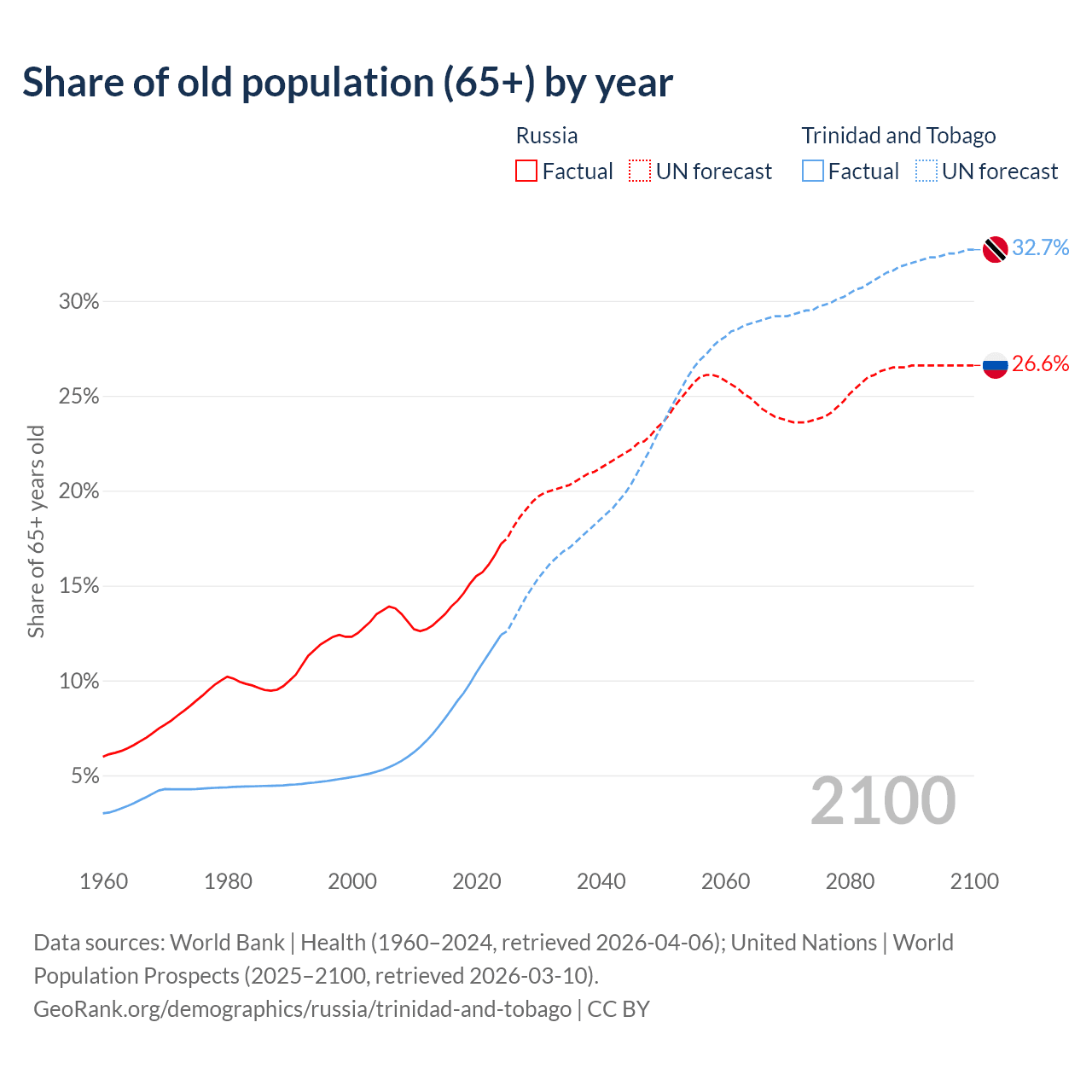 The share of older people aged 65 and over is 17.2% in Russia and 12.4% in Trinidad and Tobago. Life expectancy in Russia compared to Trinidad and Tobago .