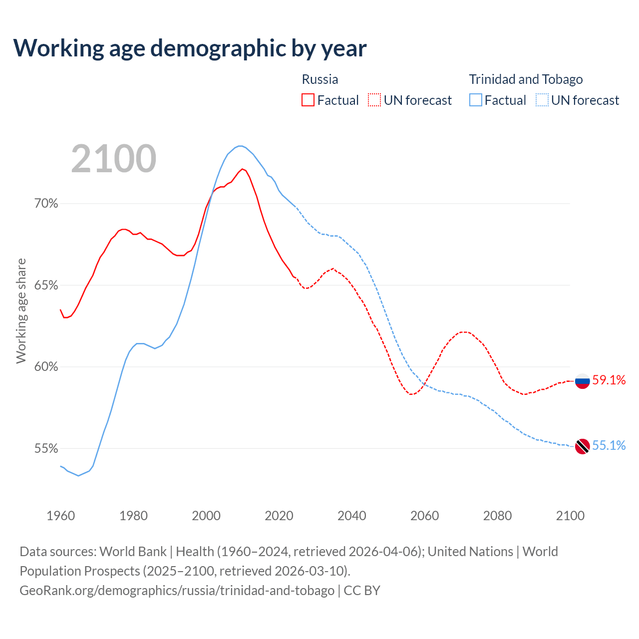 - Russia has 93M working age adults (aged 15-64) vs 960K in Trinidad and Tobago.