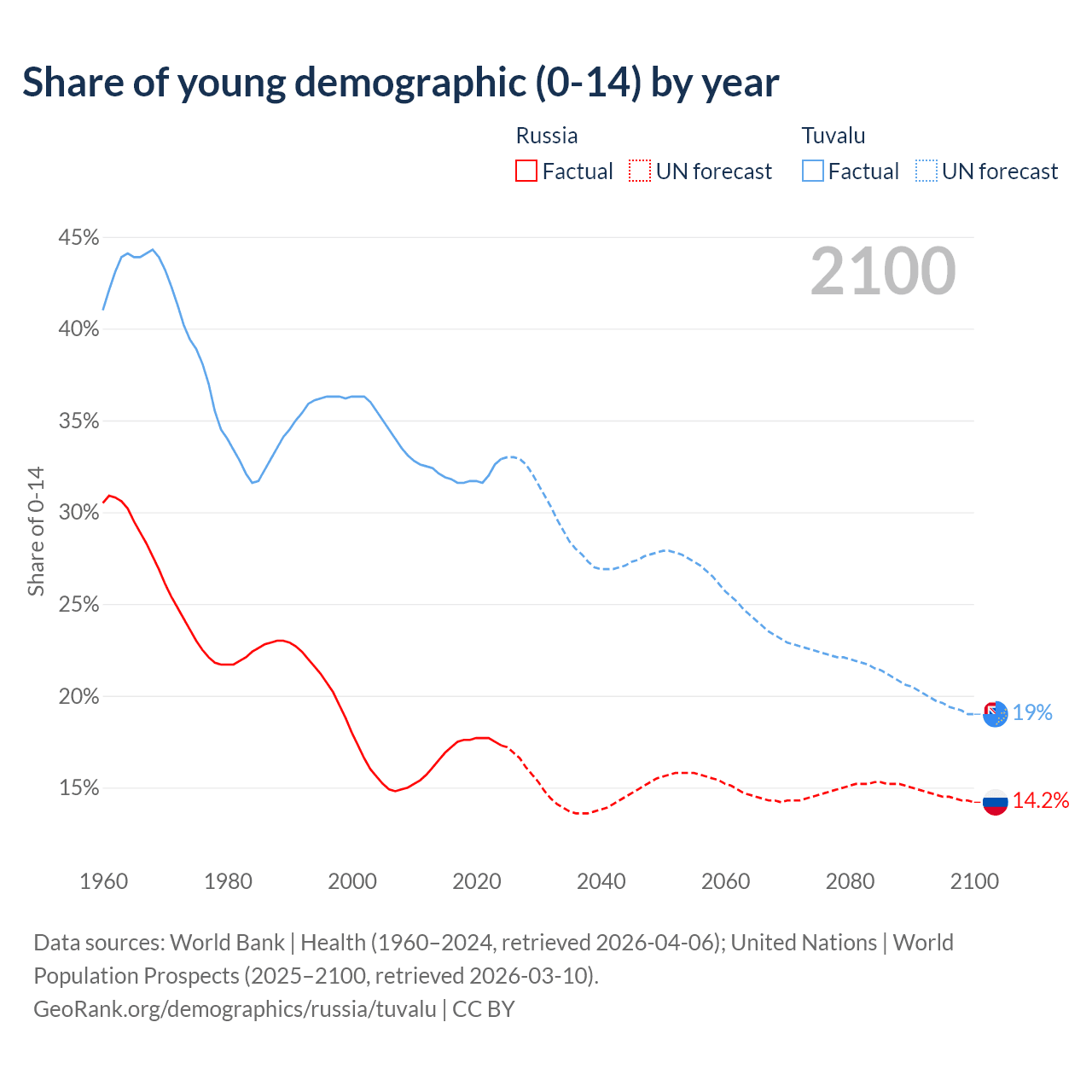 - The share of young demographic (0-15 years old) in Russia is 17.3% vs 32.9% in Tuvalu.