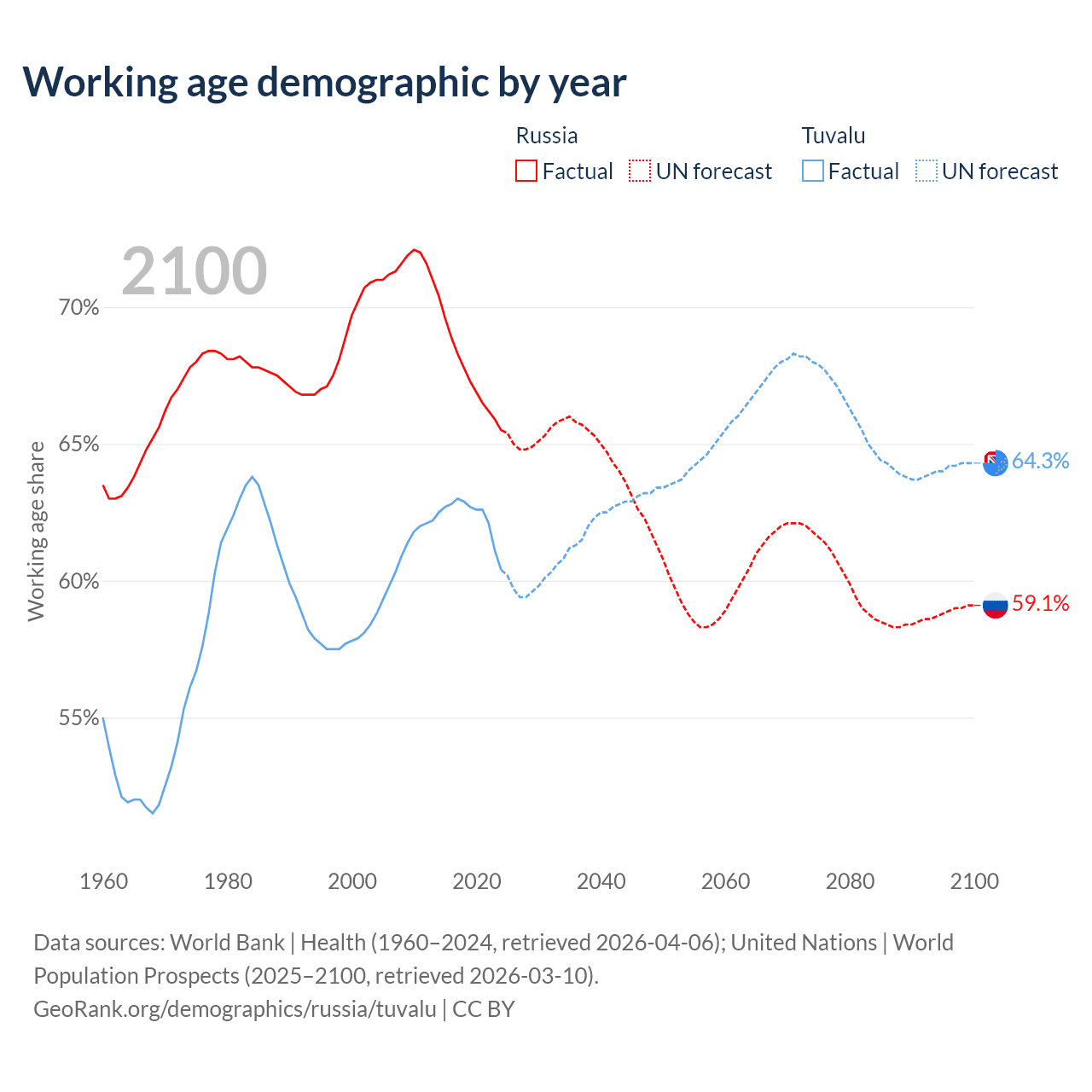- Russia has 93M working age adults (aged 15-64) vs 5.64K in Tuvalu.