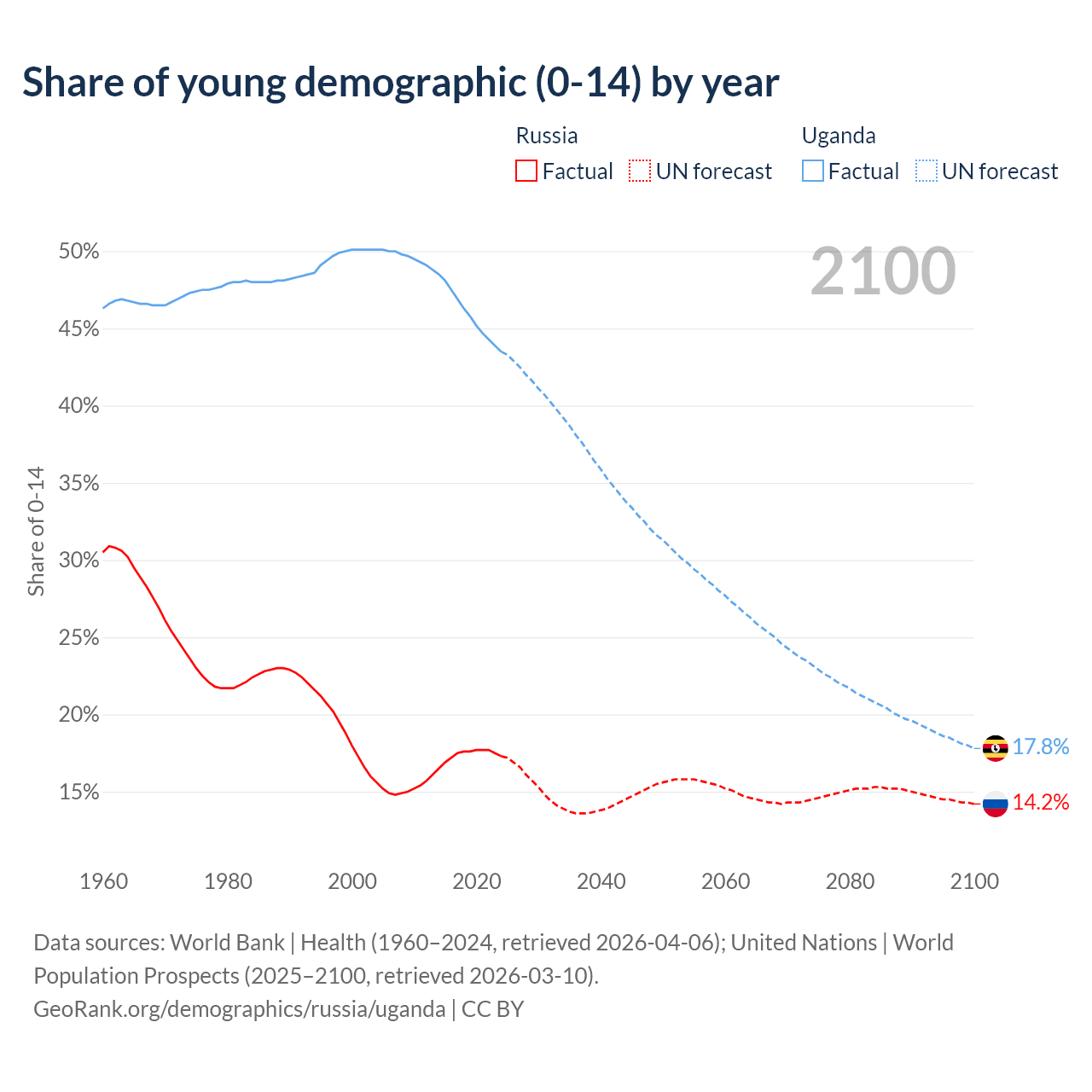 - The share of young demographic (0-15 years old) in Russia is 17.3% vs 43.5% in Uganda.
