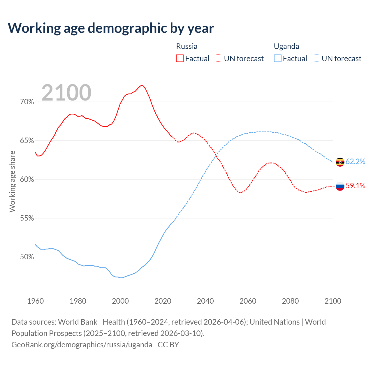 Median age Russia vs Uganda, 1960-2100
