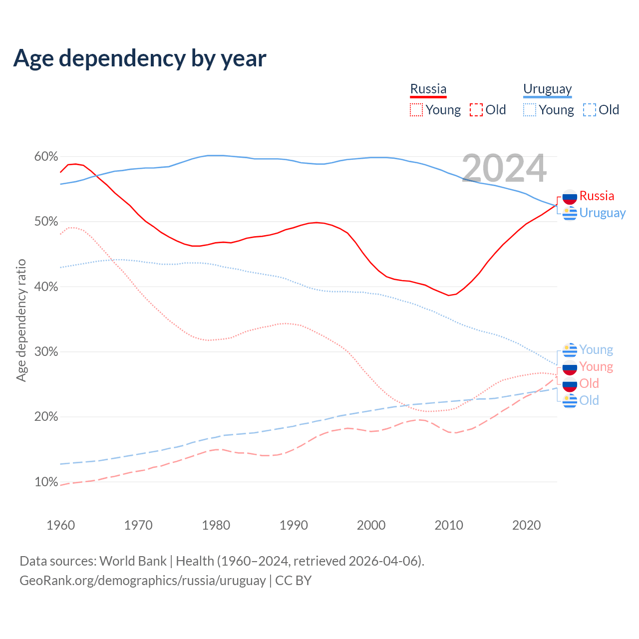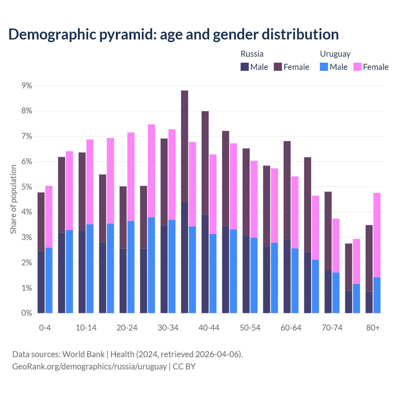 - Russia is ranked 42/196 by median age (oldest to youngest) vs 63/196 for Uruguay.