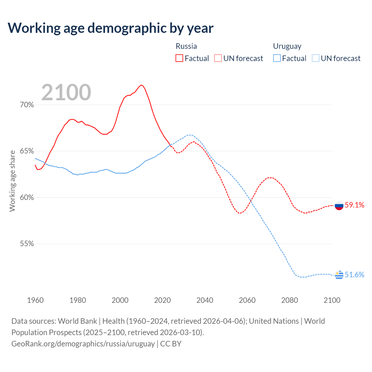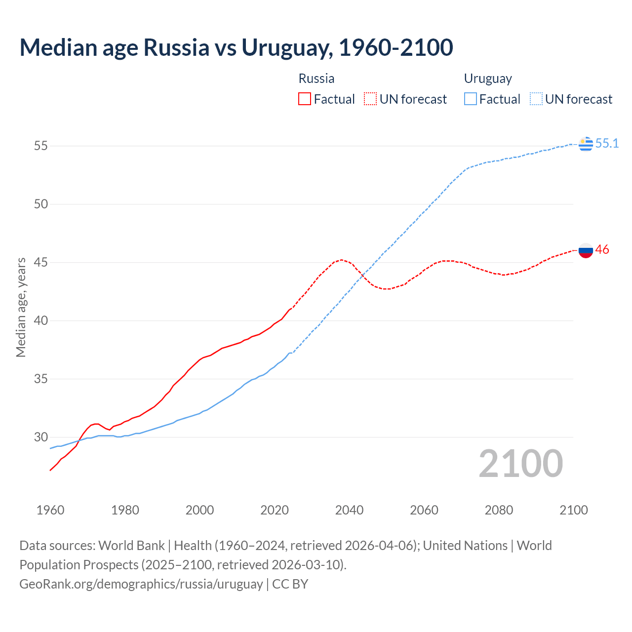 Median age Russia vs Uruguay, 1960-2100