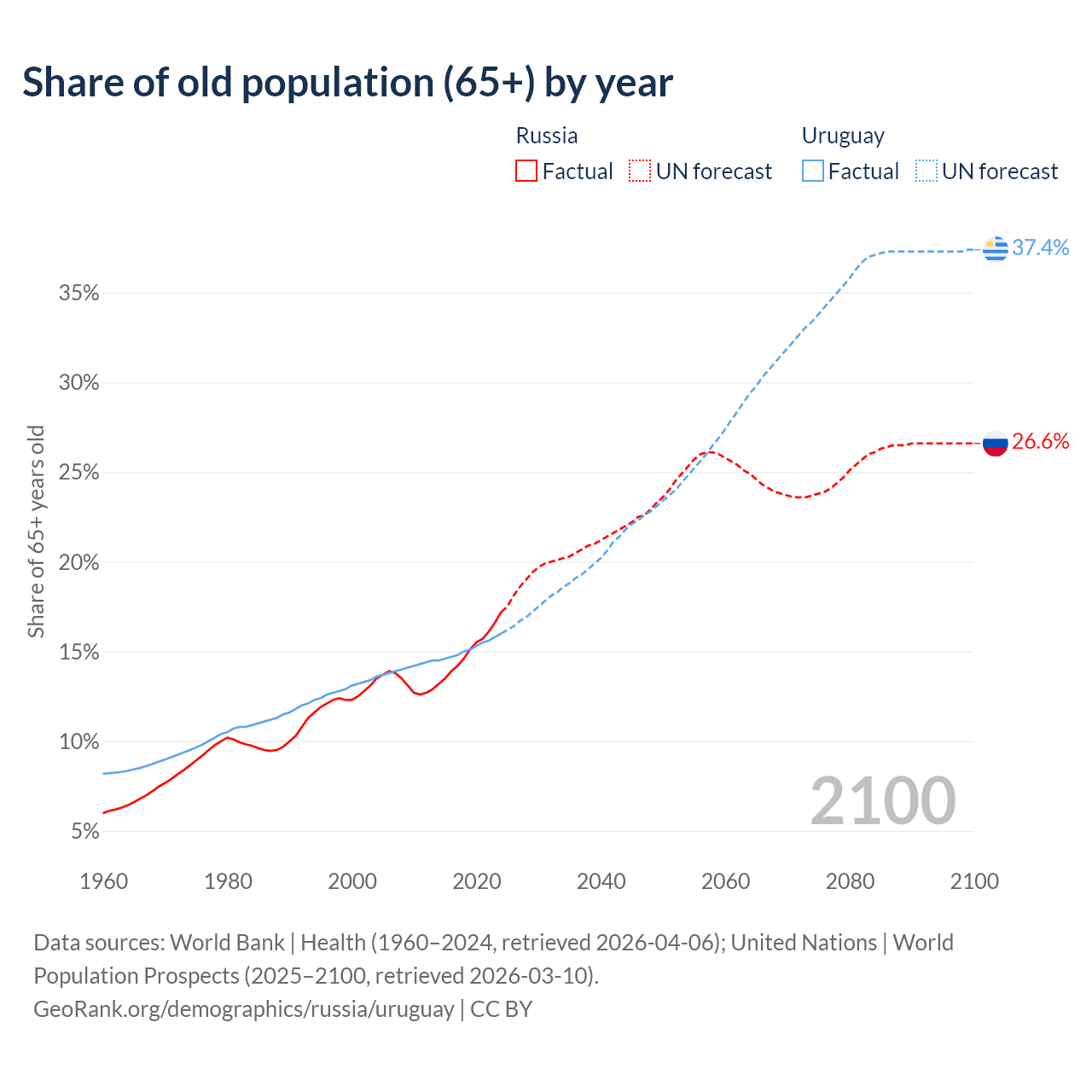 The share of older people aged 65 and over is 17.2% in Russia and 16% in Uruguay. Life expectancy in Russia compared to Uruguay .