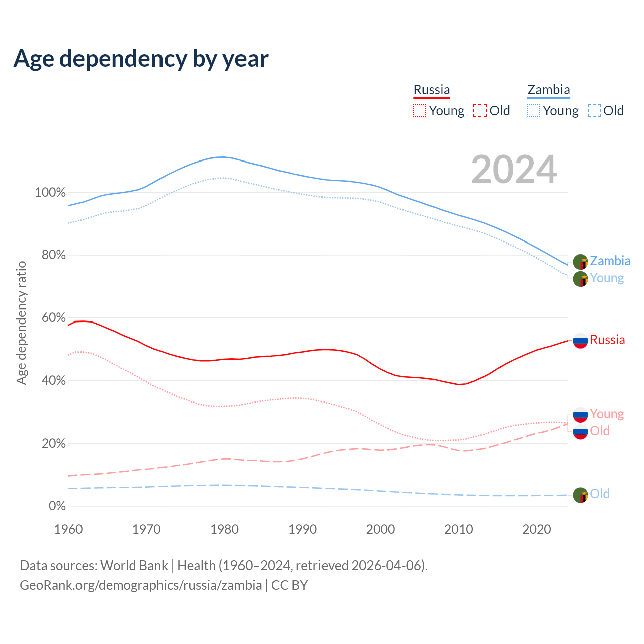 - Russia is ranked 42/196 by median age (oldest to youngest) vs 182/196 for Zambia.
