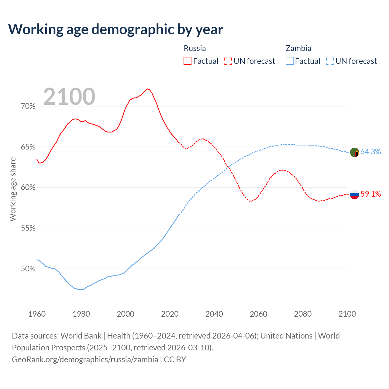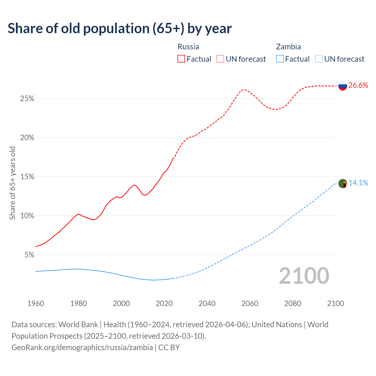 The share of older people aged 65 and over is 17.2% in Russia and 1.95% in Zambia. Life expectancy in Russia compared to Zambia .