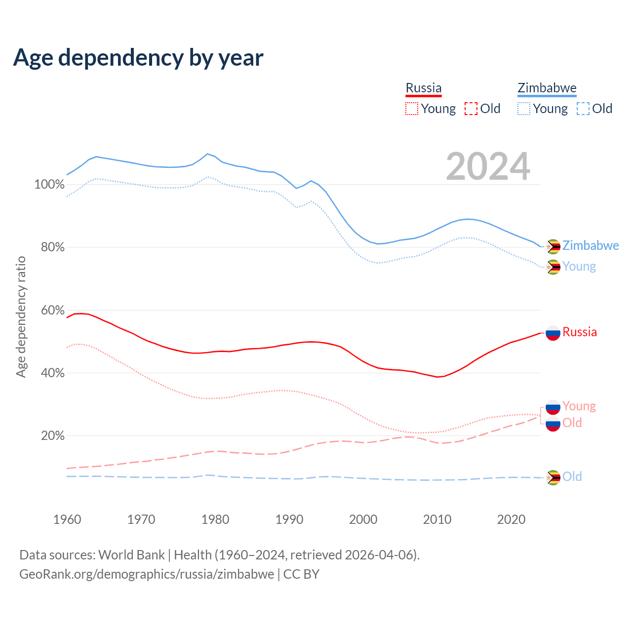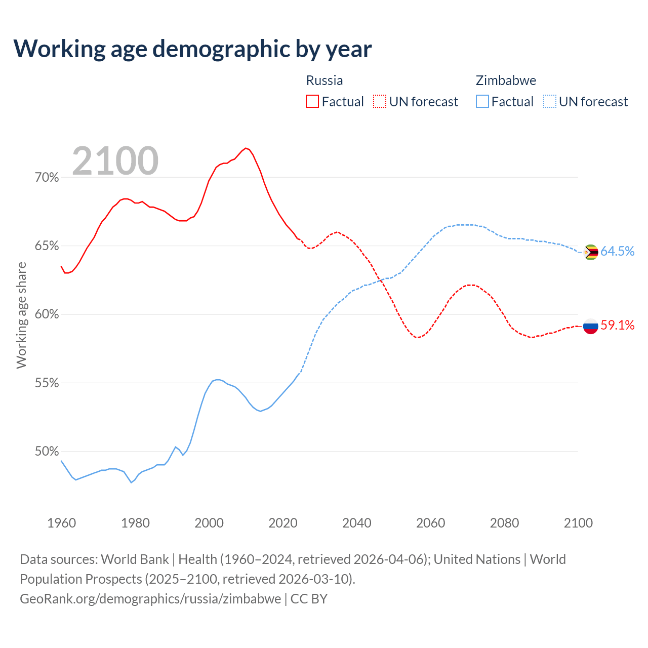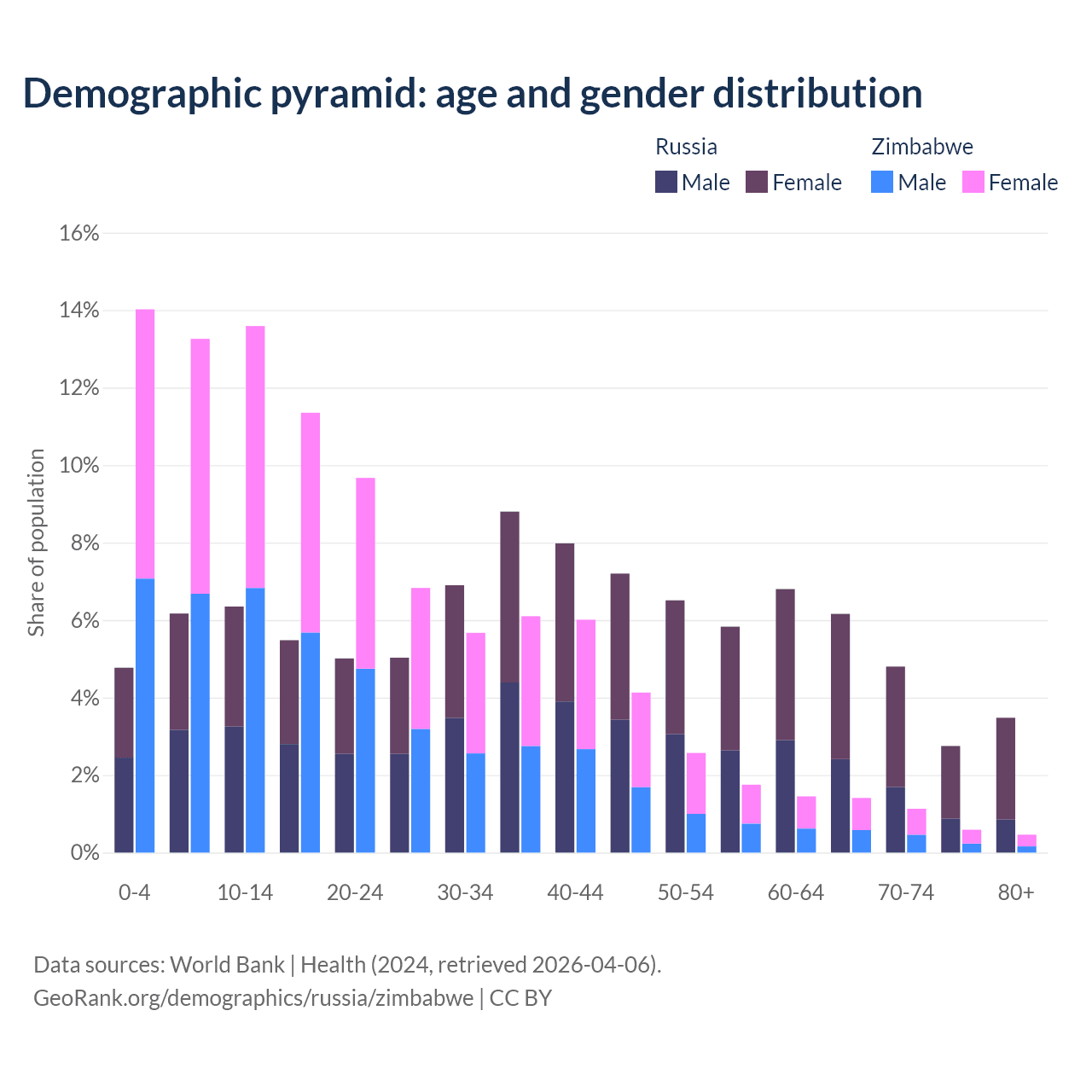 The share of older people aged 65 and over is 17.2% in Russia and 3.6% in Zimbabwe. Life expectancy in Russia compared to Zimbabwe .
