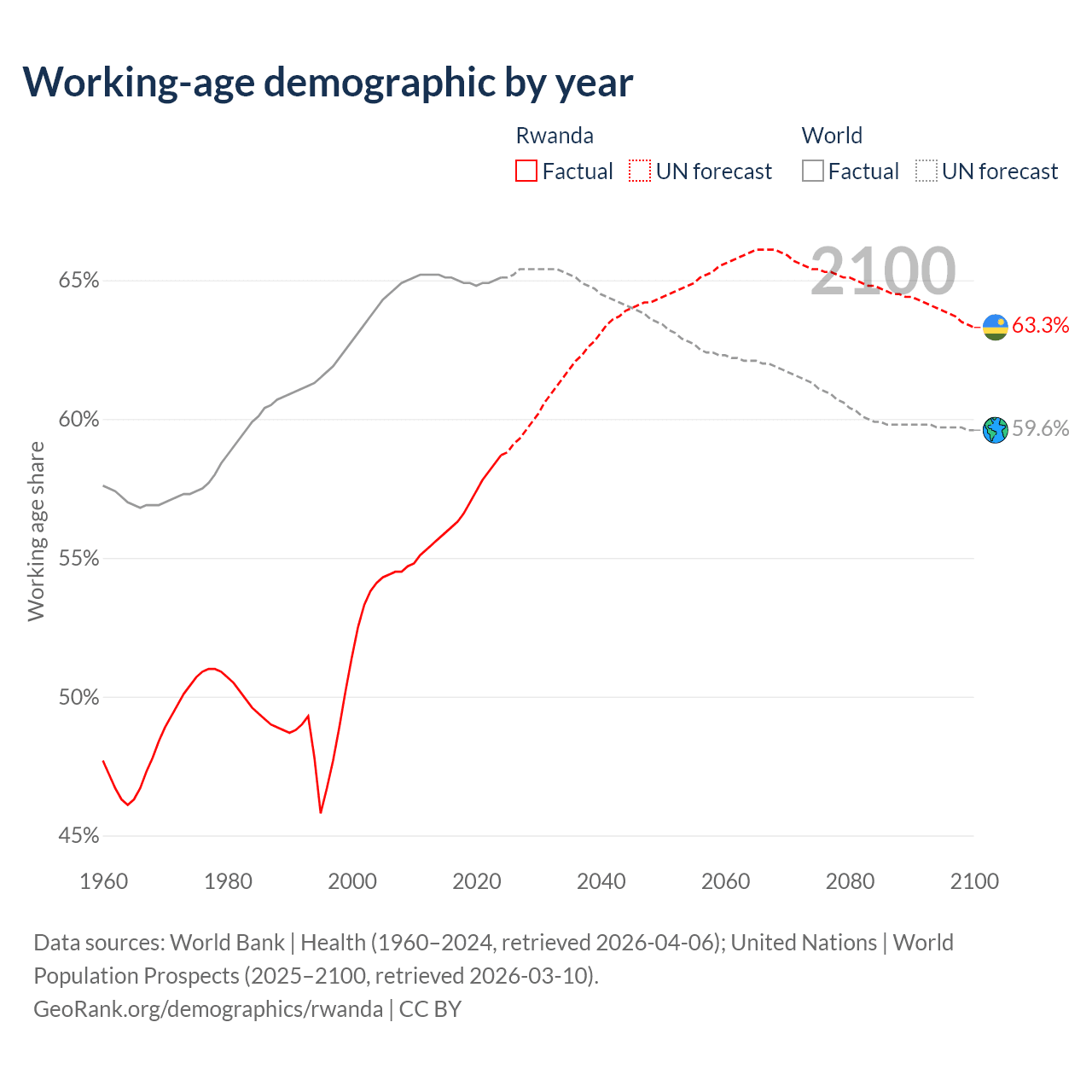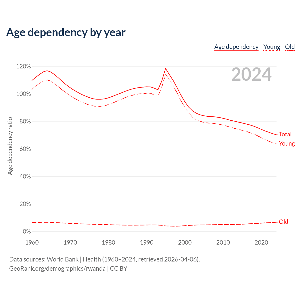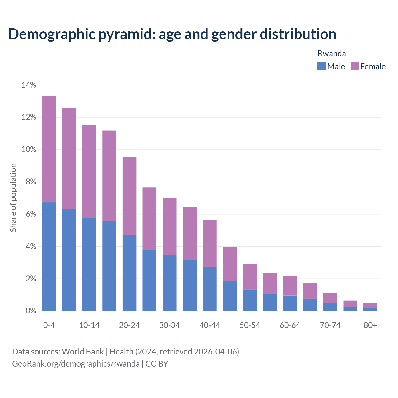 With a population of 14.3M people, Rwanda has a median age of 20.8 years which makes it the 160/196 oldest country. 37.4% of the demographic are children 0-14 years old, 58.7% are working-age people aged 15-64, and 3.93% are older population aged 65+ years.