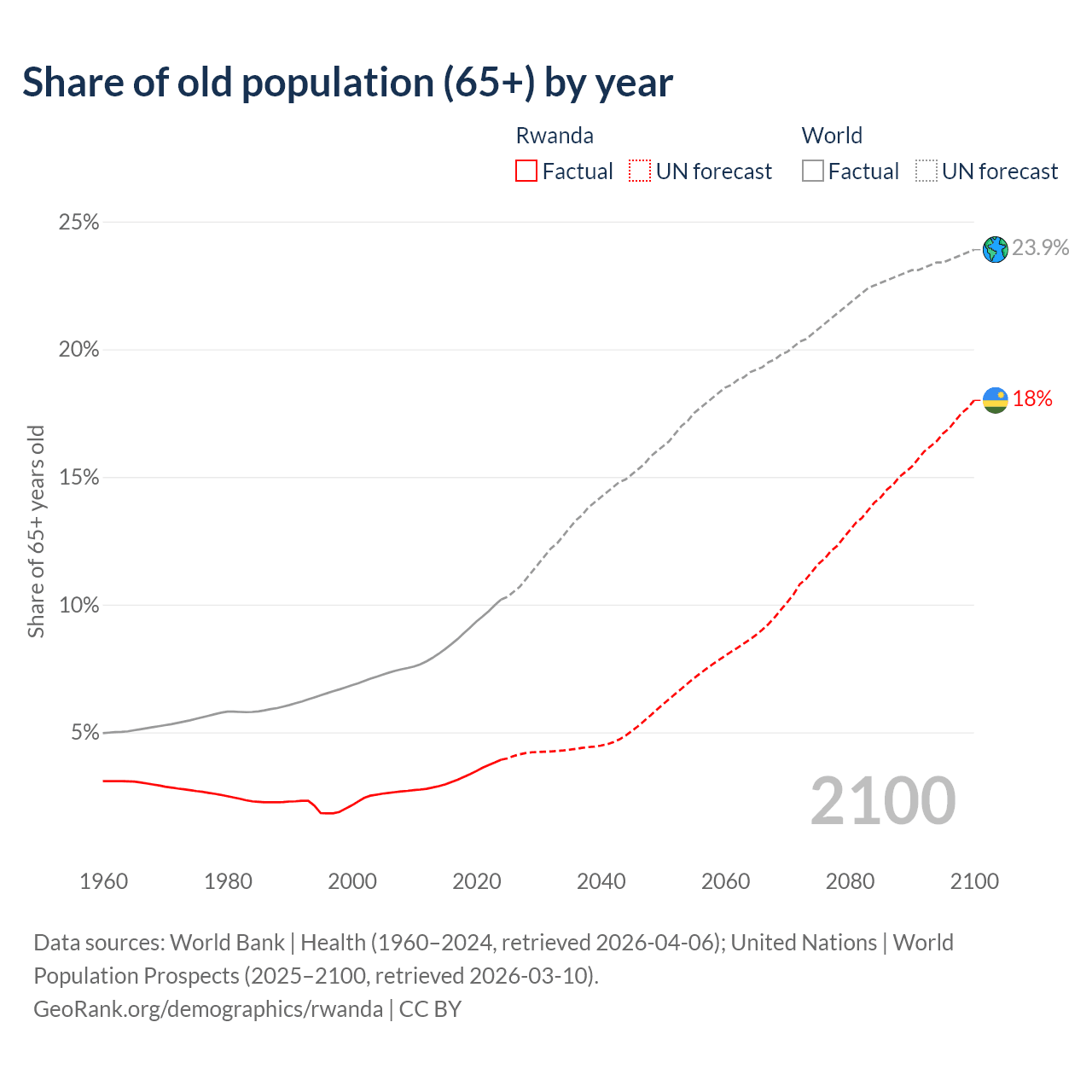 The share of older people aged 65 and over in Rwanda increased from 2.56% to 3.93% between 2004 and 2024.