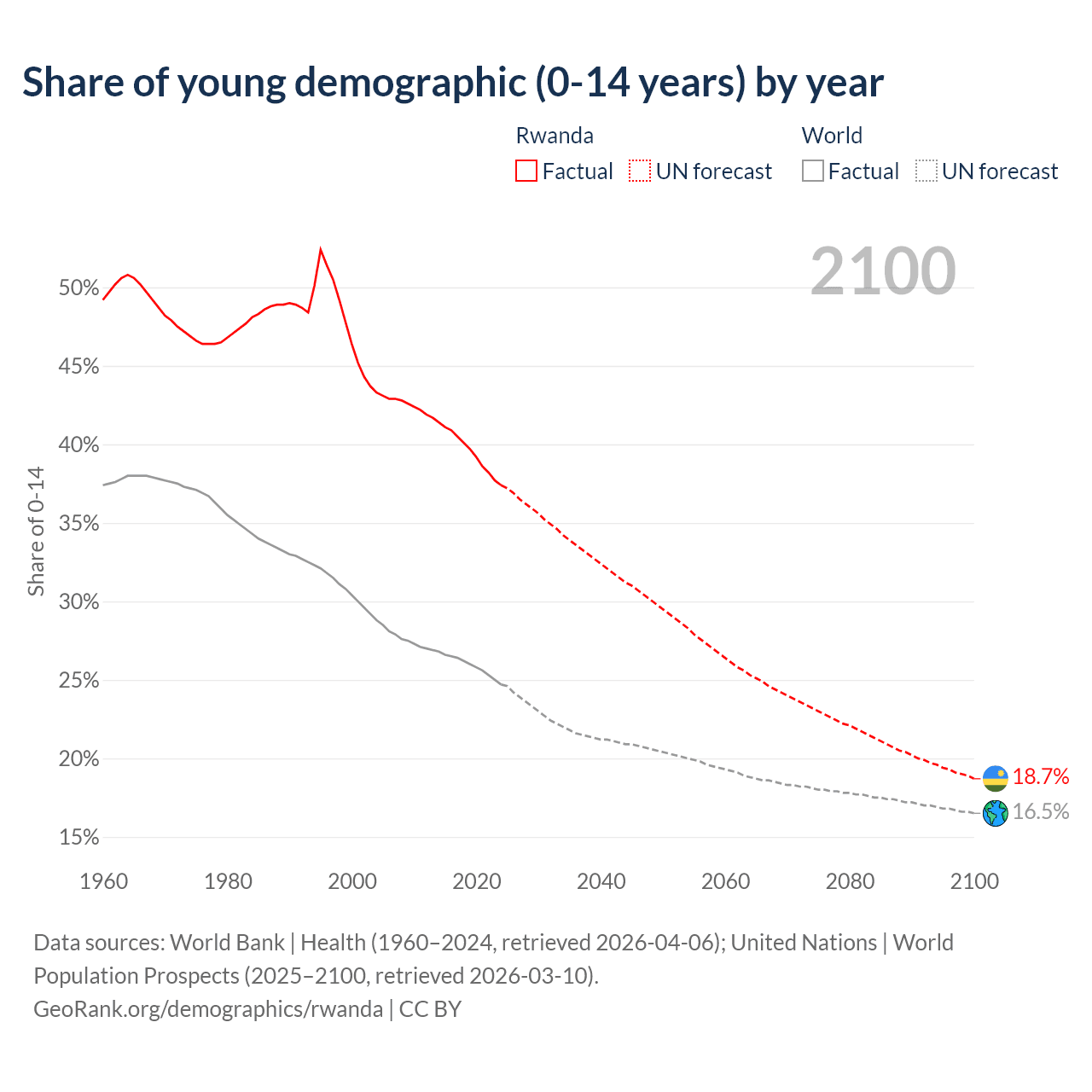 The share of children aged 0-14 in Rwanda decreased from 43.3% to 37.4% between 2004 and 2024 due to changes in birth rates.