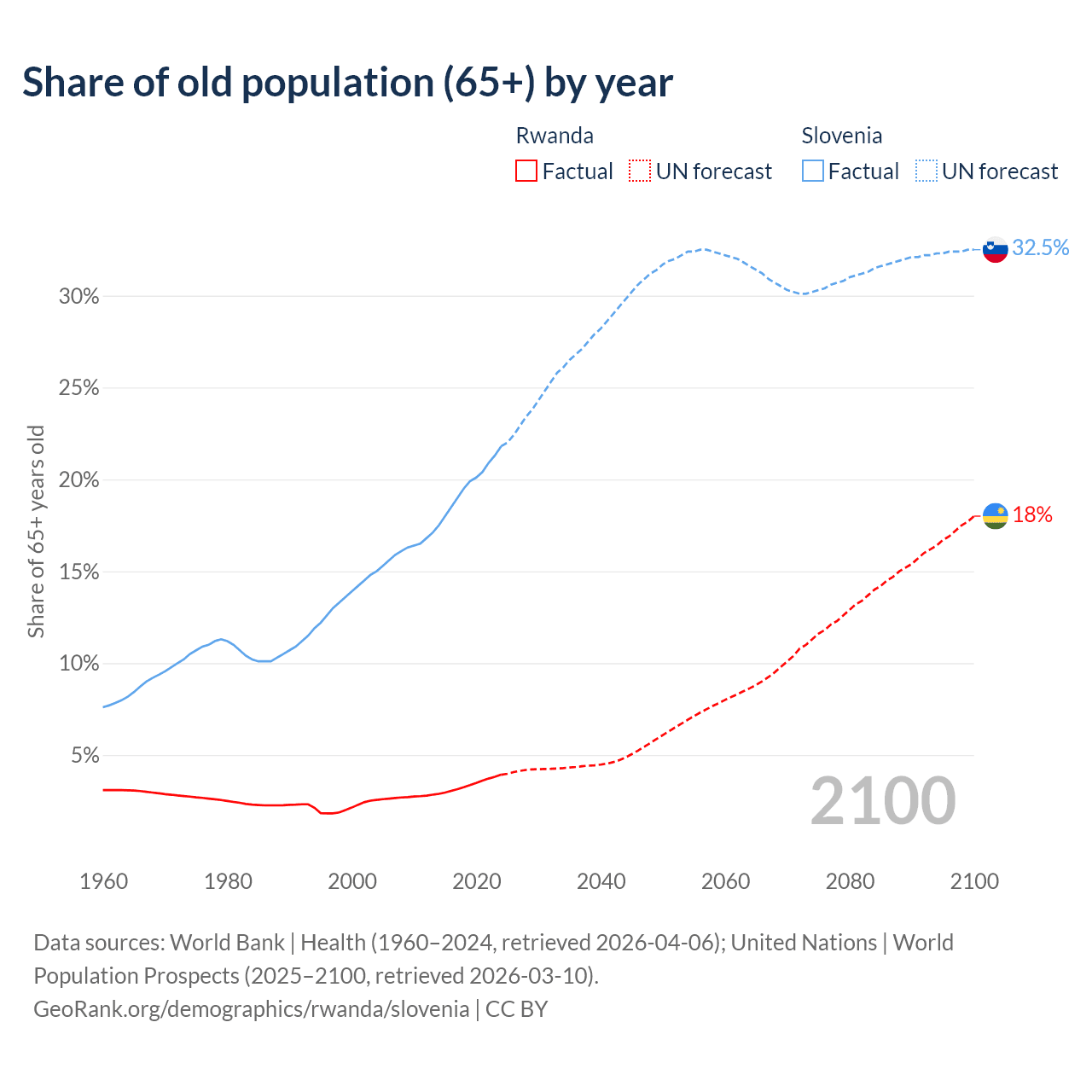 The share of older people aged 65 and over is 3.93% in Rwanda and 21.8% in Slovenia. Life expectancy in Rwanda compared to Slovenia .