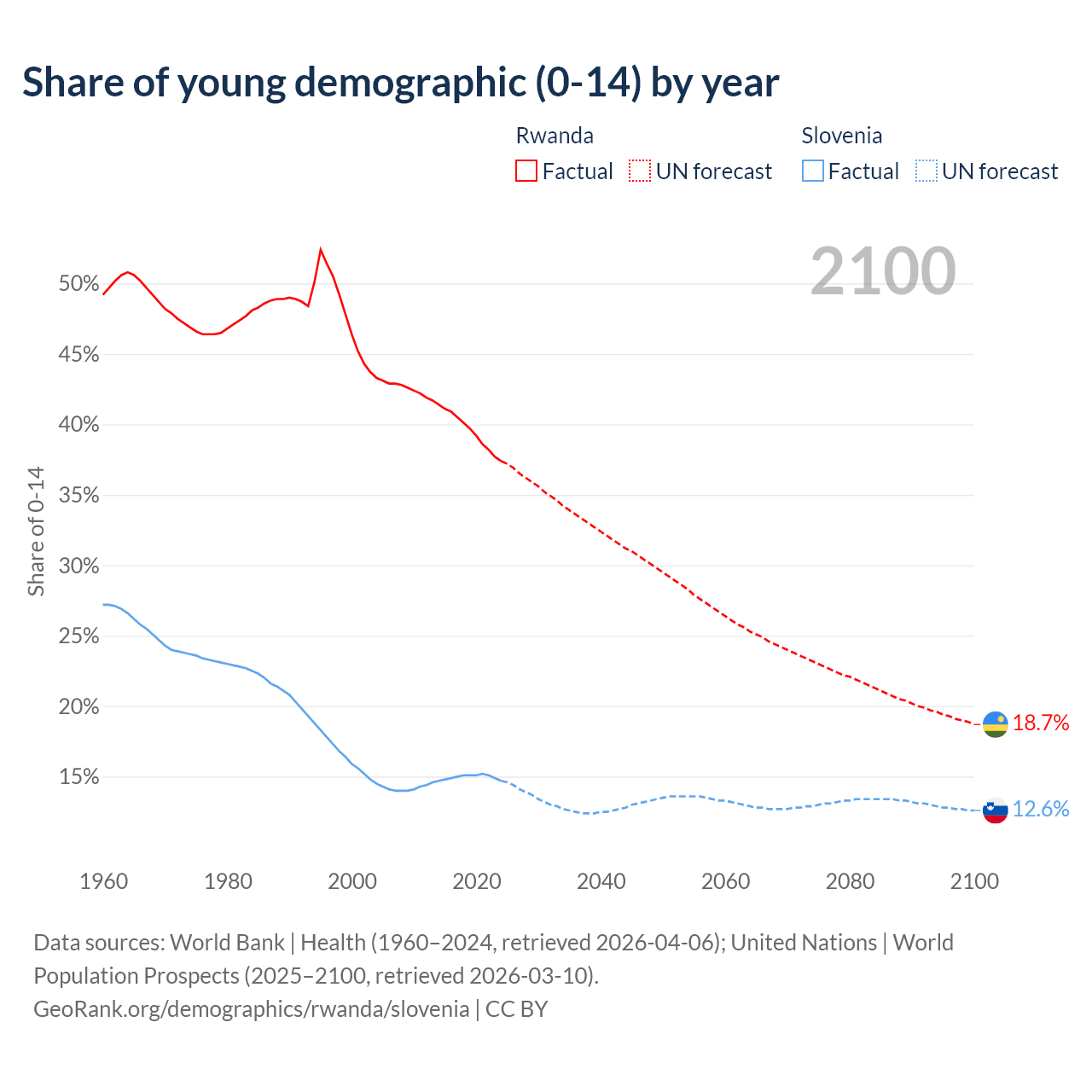 - The share of young demographic (0-15 years old) in Rwanda is 37.4% vs 14.7% in Slovenia.